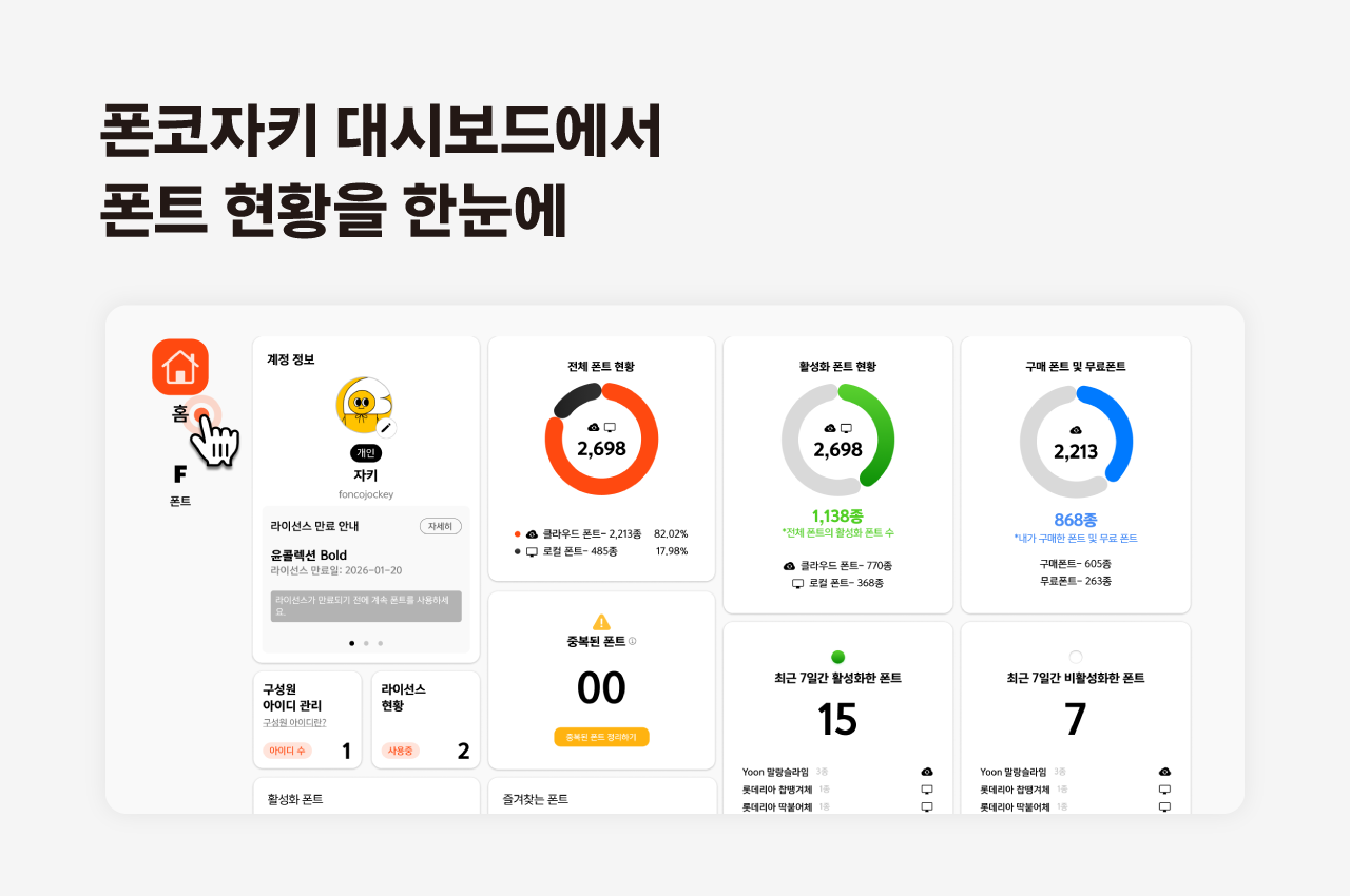 업데이트된 홈 대시보드에서 계정 정보, 활성화 폰트 현황, 라이선스 만료 안내, 중복 폰트 확인 등 폰트 관리 현황을 한눈에 파악하세요. 폰트 관리가 더욱 직관적이고 쉬워집니다.