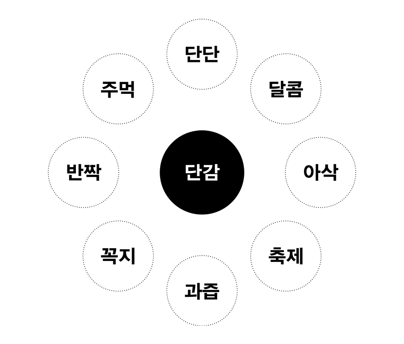 엉뚱상상에서는 서체 디자인을 시작함에 있어 ‘1차원적 생각’을 기본으로 합니다. 먼저, ‘단감’이라는 주제를 가지고 1차원적 생각으로 접근하여 가장 먼저 떠오르는 키워드로 마인드맵을 만들고, 이를 통해 컨셉 키워드를 도출합니다.