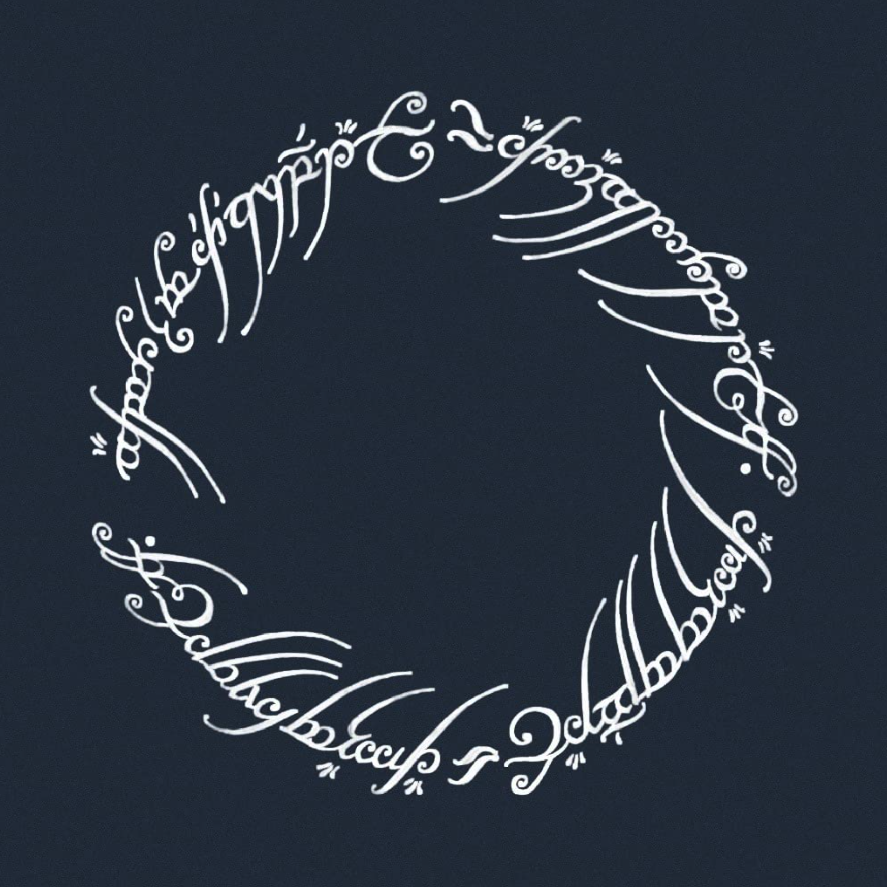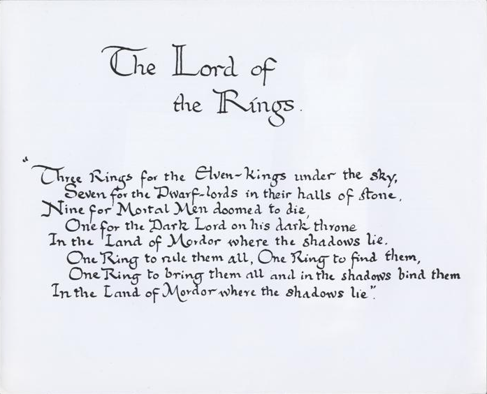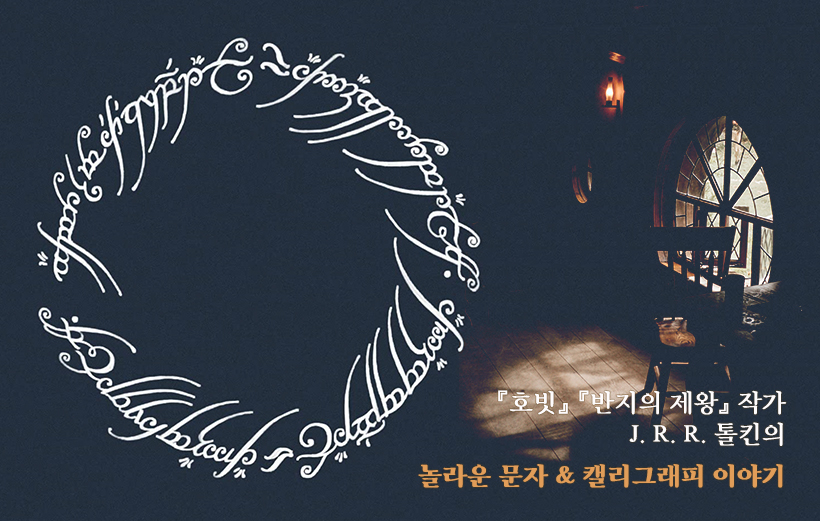톨킨은 또한 일러스트레이터이자 캘리그래퍼이기도 했습니다. 『호빗』과 『반지의 제왕』 3부작에는 그가 직접 그린 삽화, 직접 쓴 손글씨가 본문 곳곳에 스며 있어요. 가장 대표적인 것이 『반지의 제왕』 속 ‘절대반지’에 새겨진 글귀(소설 배경인 ‘중간계’의 고대 문자)입니다. 피터 잭슨 감독의 실사판 영화에도 등장한 바 있죠.
