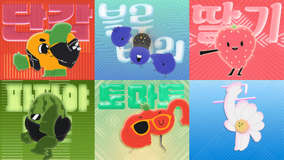 먼저 각각의 창원시 농산물을 레터링으로 표현했습니다. 단감은 단단하고 아삭하며 달콤한 이미지를 글자로 구성했고, 블루베리는 귀여운 이미지로 ‘슉슉쇽쇽’이라는 의성어와 어울리도록 고무줄처럼 늘었다 줄어드는 형태에서 착안해 글자를 만들었습니다. 딸기는 상큼하고 톡톡 튀는 이미지와 작은 열매가 맺힌 형태를 글자에 녹였고, 파파야 메론은 단단한 질감과 부드러운 형태를 접목했죠. 토마토는 ‘츄왑츄왑’ 물렁한 특징을 살렸고, 꽃차는 편안하고 부드러운 이미지와 향이 전달되는 것처럼 하늘하늘하고 가벼운 형태로 제작했습니다.