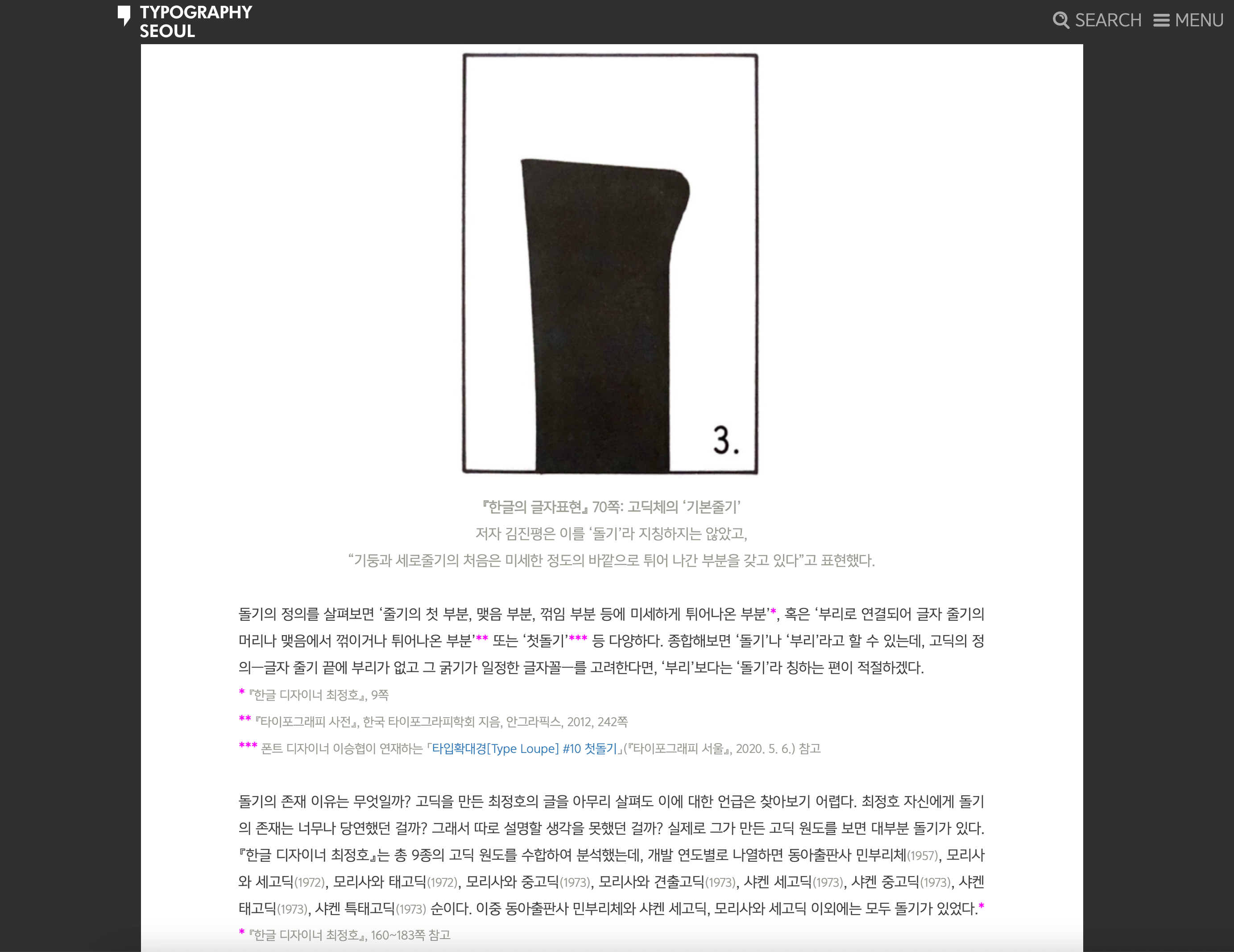 폰트 디자이너 이승협이 연재하는 콘텐츠입니다. 한글과 라틴 알파벳의 ‘각부(글자를 이루는 각 부분)’를 확대경(루뻬, loupe)으로 들여다본다, 라는 콘셉트로 진행하고 있어요. 벌써 30회 넘게 연재 중입니다. 1~30회까지는 한글 각부를 다뤘고, 31회부터 라틴 알파벳 각부를 설명하고 있죠. 단순히 각부 명칭만 알아보는 게 아니라, 폰트 디자인에서 어떤 기능을 하는지까지 해설합니다. 「타입 확대경」을 ‘폰트 디자이너를 위한 초급 가이드북’으로 활용하셔도 좋겠습니다.