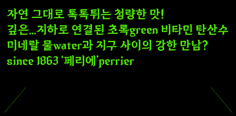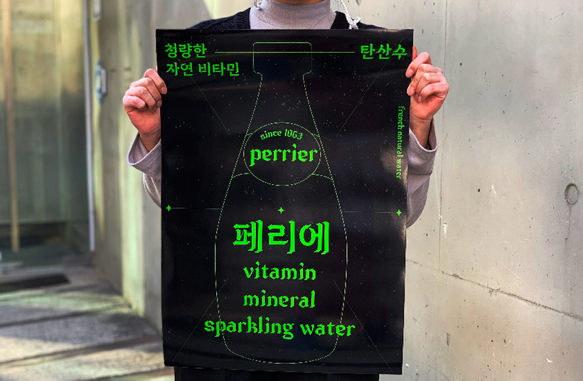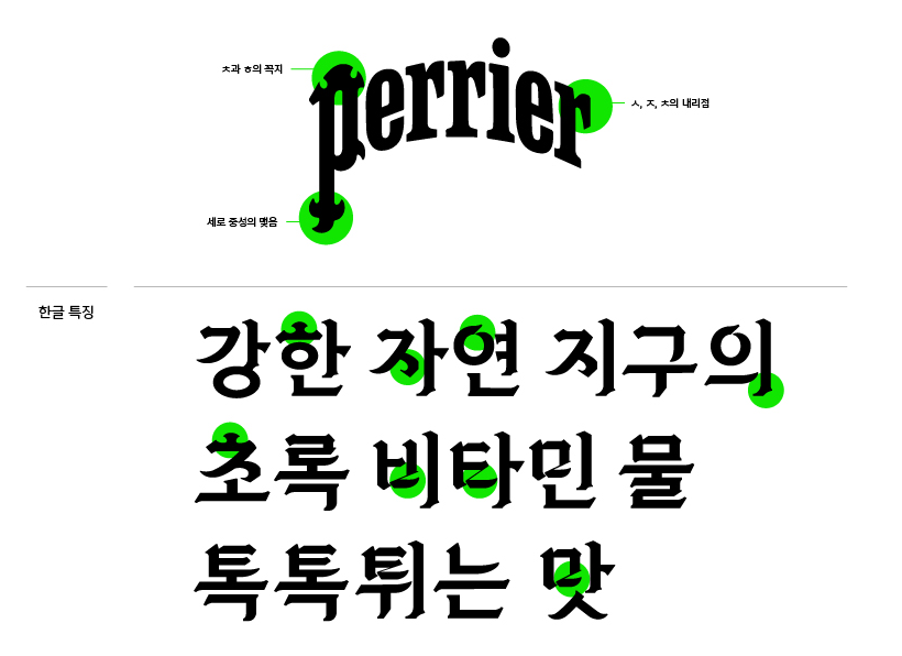 제가 제작한 「페리에체」는 페리에 로고의 화려함과 오랜 역사를 콘셉트로 한글 43자, 라틴 알파벳 소문자와 숫자, 문장부호로 완성했습니다. 「페리에체」는 화려하지만 굵은 굵기로 가볍지 않은 진지한 모습을 보여줍니다. 레터링 문구는 페리에의 청량함을 나타내고자 했습니다.