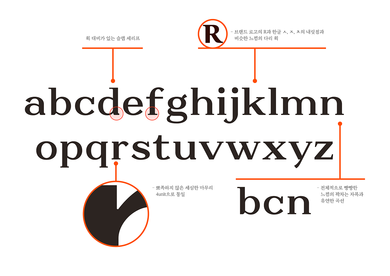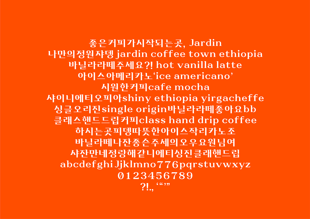 이런 특징들로 한글을 디자인했고, 영문과 숫자 또한 한글과 잘 어우러지도록 디자인했습니다. 영문 ‘o’와 숫자 ’0’은 한글의 ‘ㅇ’의 스타일로 통일감 있게 디자인했습니다. 하지만 다소 답답해 보이는 문제점들로 인해 겹치는 부분을 띄어주면서 속공간을 시원하게 조정하면서 많은 테스트를 진행했어요.