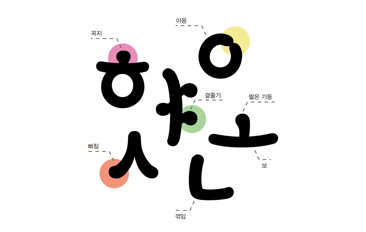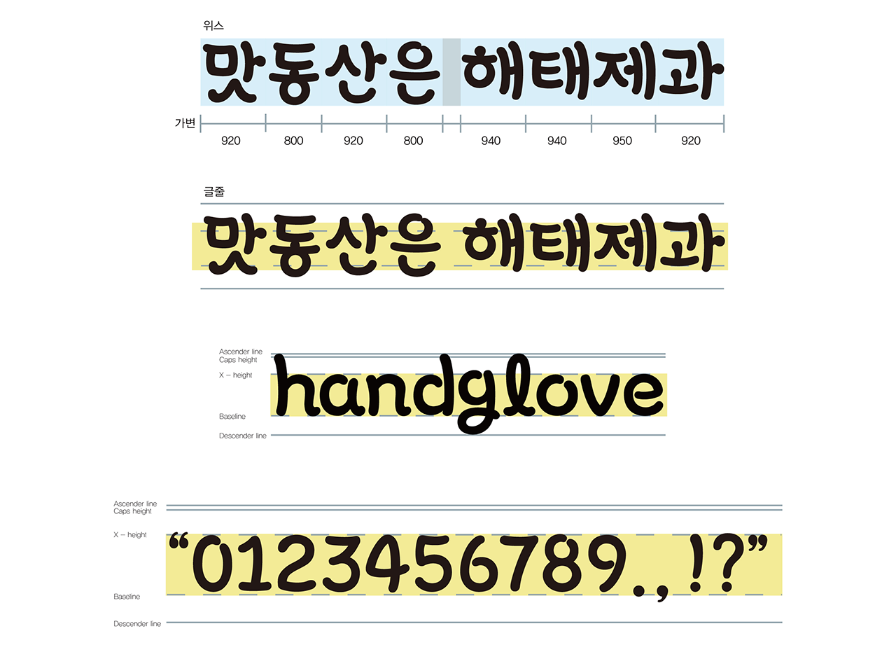 작업 내내 맛동산을 먹는 기분으로 달달한 시간을 보내왔던 것 같아요. 맛동산처럼 전용서체 역시 끝맺음이 동글동글하고 곡선으로 이루어져서 먹음직스럽게 느껴지면 좋겠다고 생각했거든요. 그래서 인상은 귀엽고 동글동글하며 맛동산의 형태를 떠오르게 하는 서체를 만들게 되었습니다.