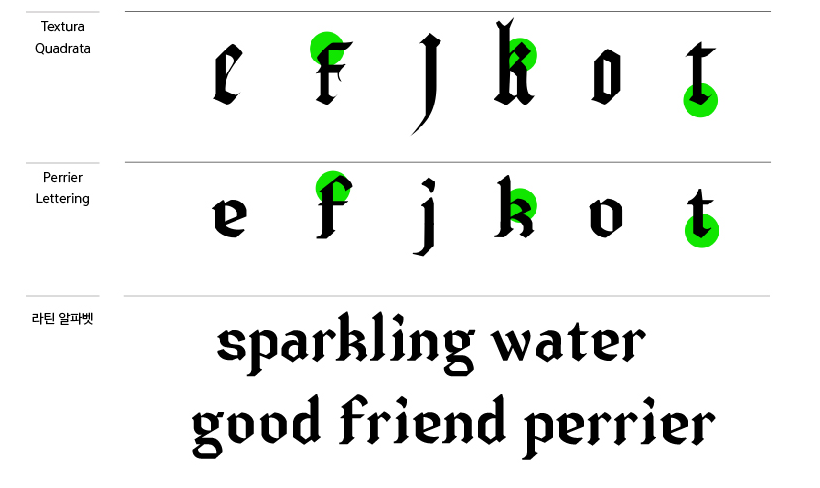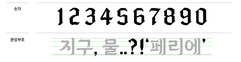 라틴 알파벳과 숫자, 문장부호에서는 한글의 직선적인 특징을 살리면서도 전통성을 살리기 위해 블랙레터의 쓰기법과 인상을 연구하고 디자인했습니다. 특히 라틴 알파벳과 숫자는 텍스츄라(Textura Quadrata)를 참고했는데, 작업하다 보니 기존 페리에 로고와 인상이 많이 달라져 재미있고 흥미로웠습니다. 문장부호의 크기감과 위치는 한글의 직선적인 형태와 어울리게 제작했습니다.