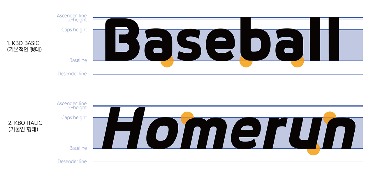 영문의 경우 KBO의 대문자를 바탕으로 소문자를 디자인했는데요, 대문자의 속공간이 큰 것을 그대로 적용해 속공간이 크며 스퍼(Spur)를 생략한 소문자 영문을 만들었습니다. 영문은 세워서 쓰는 기본적인 형태의 글꼴, 기울어진 형태의 글꼴 2가지 스타일로 제작해봤습니다.