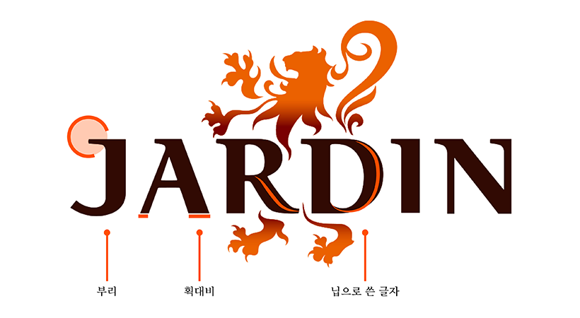 사실 이런 재미있는 이야기가 쟈뎅을 선택한 이유는 아니고요. 쟈뎅의 로고 타입이 한글화하기에 매력적이라고 생각했기 때문이에요. 심플하면서도 고급스러운 브랜드 로고는 닙으로 쓴 느낌이 강해요. 그래서 생긴 뚜렷한 획 대비와 세리프가 포인트입니다. 저는 이 부분들이 한글화하기에 적합하다고 생각했어요. 여기에 쟈뎅이라는 브랜드가 추구하는 부드럽고 우아하고 현대적인 이미지를 살린 서체를 만들고 싶었어요. 인상을 먼저 결정하고, 글자를 기획해서 디자인하고 표현해내는 것 그것이 제 이번 과제의 가장 큰 목표였습니다.