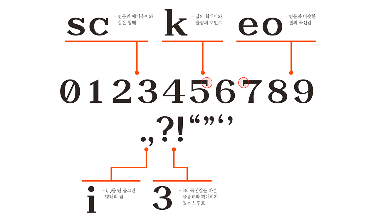 숫자와 특수문자는 영문의 느낌을 많이 따라갔어요. 그래서 빵빵하고, 곡선이 특징인 슬랩의 획 대비를 가졌어요. 숫자와 특수문자도 처음이다 보니 다양하게 많이 찾아보고 또 이런 서체에 포함되는 글자 결을 같게 하려고 계속 고민하고 찾아보았던 것 같아요. 처음에는 글자가 가진 역사나 의미에 좀 더 집중했다면 나중에는 형태 자체가 같이 놓였을 때 ‘하나의 서체로 보이는가?’ 이 부분을 파악하려고 많이 노력했습니다.