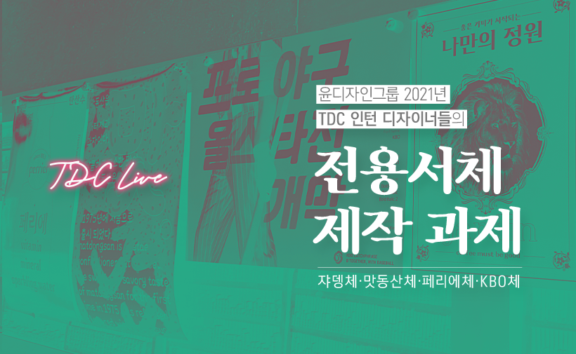 지난해, 윤디자인그룹의 TDC(Type Design Center) 인턴사원들의 교육과 함께 한글 글꼴 디자인 과제를 소개해드렸었는데요, 참 반응이 뜨거웠습니다. 재기발랄한 인턴사원들의 작업물은 각자의 개성과 감각을 엿볼 수 있었죠. 그래서 올해도 준비했습니다. TDC의 이가희 책임 디자이너가 2021년 인턴 디자이너들의 전용서체 제작 과제를 소개합니다.