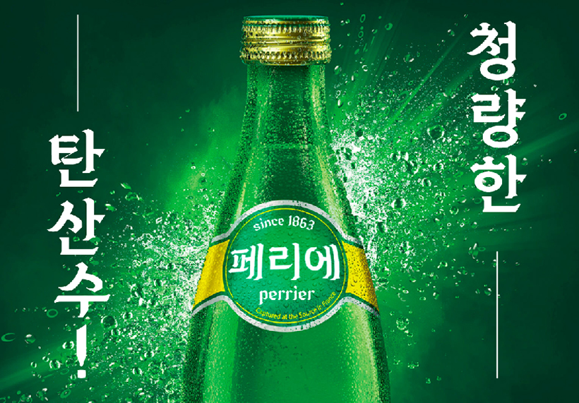페리에는 기원전 218년 프랑스의 한니발(Hannibal Barca) 장군이 전쟁을 마치고 돌아오면서 유명한 온천에서 갈증을 해소했다는 기록에서 시작됩니다. 루이 유진 페리에(Louis Eugène Perrier)는 이 온천을 상품화시키기 위해 연구를 진행했고, 1903년 존 함스워스 경(Sir John Harmsworth)이 이어받아 페리에 광천수 회사를 설립하게 됩니다. 흥미로웠던 사실은 영국과 스페인 왕실에서 공식적으로 공급이 되면서 유명세를 치렀다는 것입니다. 저는 자연 온천에서 시작됐다는 점과 오랜 역사로 왕실에도 공급되었다는 사실이 기억에 남아 이를 한글 콘셉트에 적용해보기로 했습니다.
