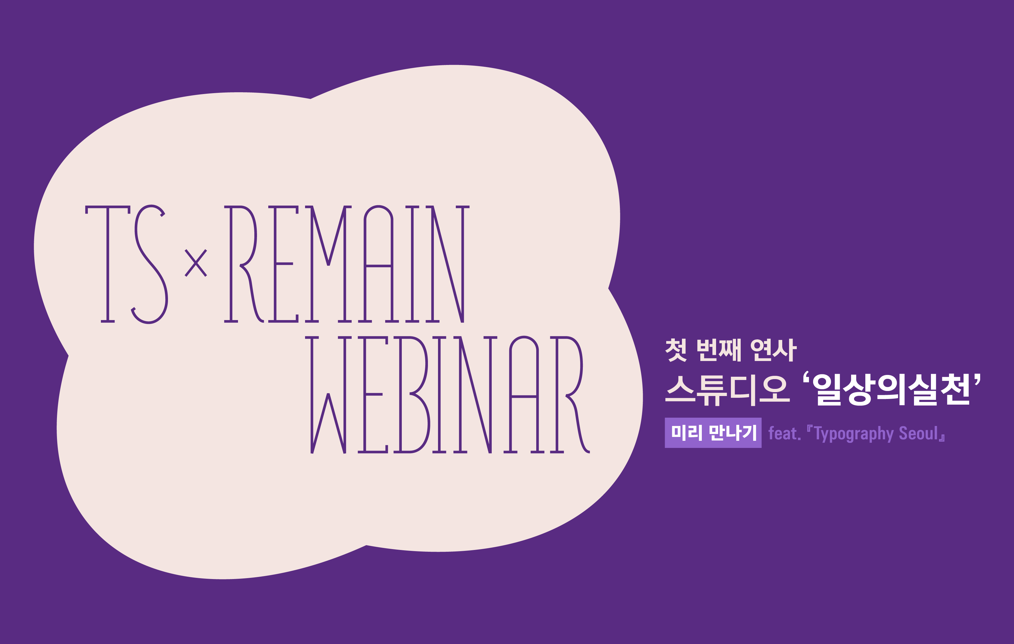 윤디자인그룹이 운영하는 디자인 웹진 『타이포그래피 서울』(약칭 ‘TS’), 디자인 교육 콘텐츠 플랫폼 ‘Remain’이 함께 VOD 세미나 시리즈를 론칭합니다. 바로 〈TS × Remain Webinar〉인데요. 웹(web)과 세미나(seminar)를 합친 웨비나(webinar)라는 말, 요즘 자주 들어보셨을 거예요. 코로나19 이후 기존의 오프라인 세미나가 온라인 플랫폼으로 전환되면서 생겨난 용어죠. 말 그대로 ‘웹 세미나’를 의미합니다.