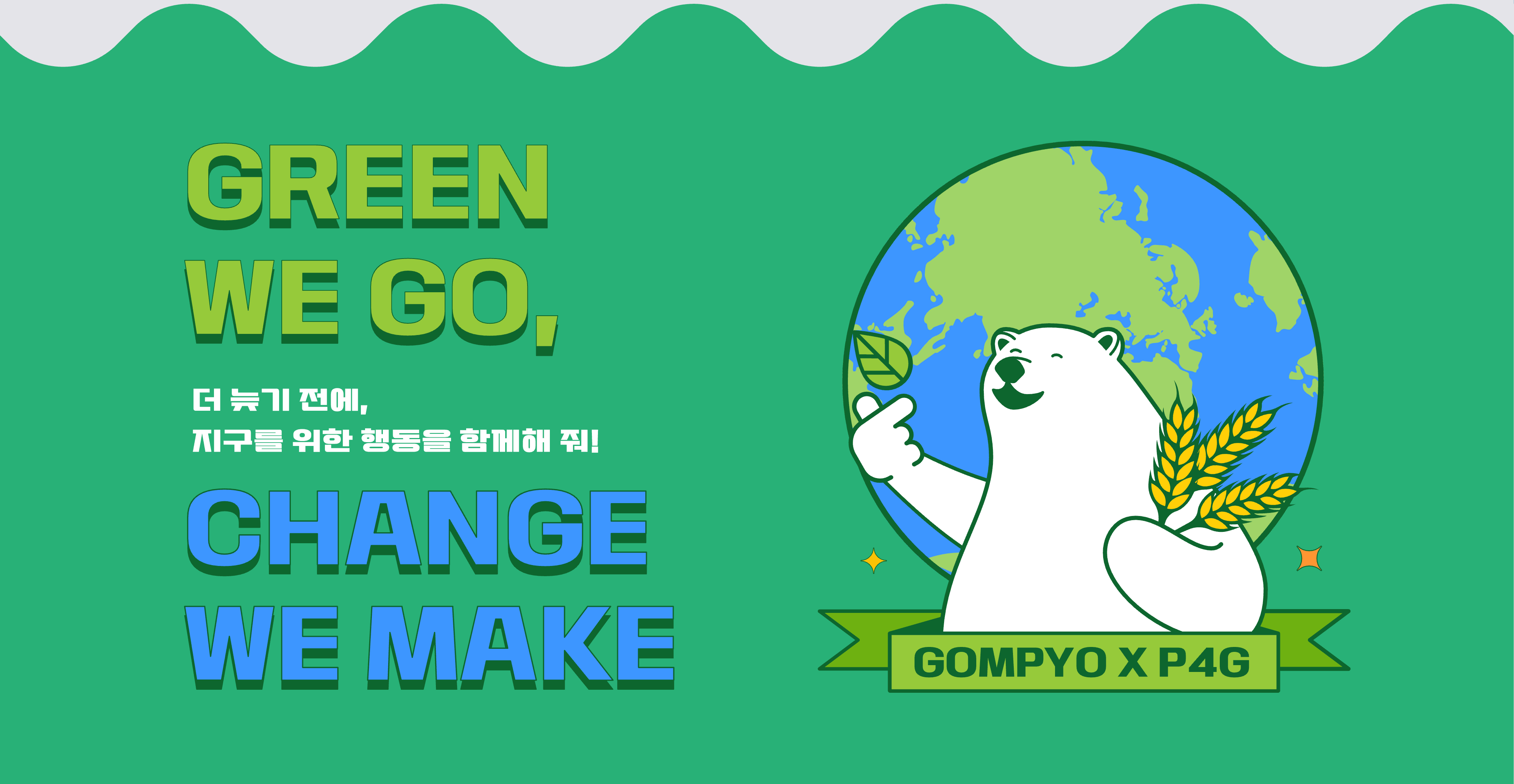 〈P4G 서울 정상회의〉는 5월 30일과 31일 양일간 개최되는 대한민국 최초의 환경 분야 다자정상회의입니다. 2018년 10월 덴마크 코펜하겐에서 첫 정상회의가 개최되었고, 이번 제2차 정상회의는 바로 우리나라 서울에서 열립니다. P4G는 ‘녹색성장과 글로벌 목표 2030을 위한 연대(Partnering for Green Growth and the Global Goals)’의 약칭이죠. 이 국제적인 행사를 위해 우리 모두 ‘친환경 수다’를 시작해보면 어떨까요? 곰표 폰트(곰표체)와 함께, 그리고 「그린메시지 챌린지」와 함께 말예요.