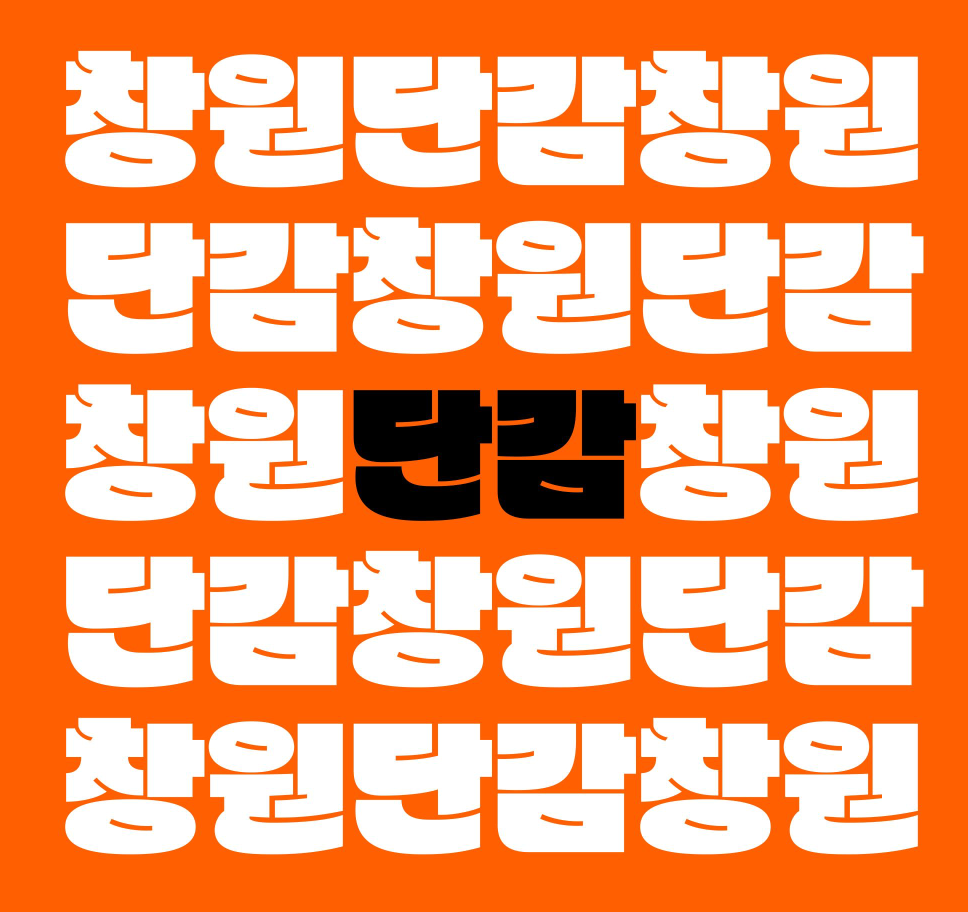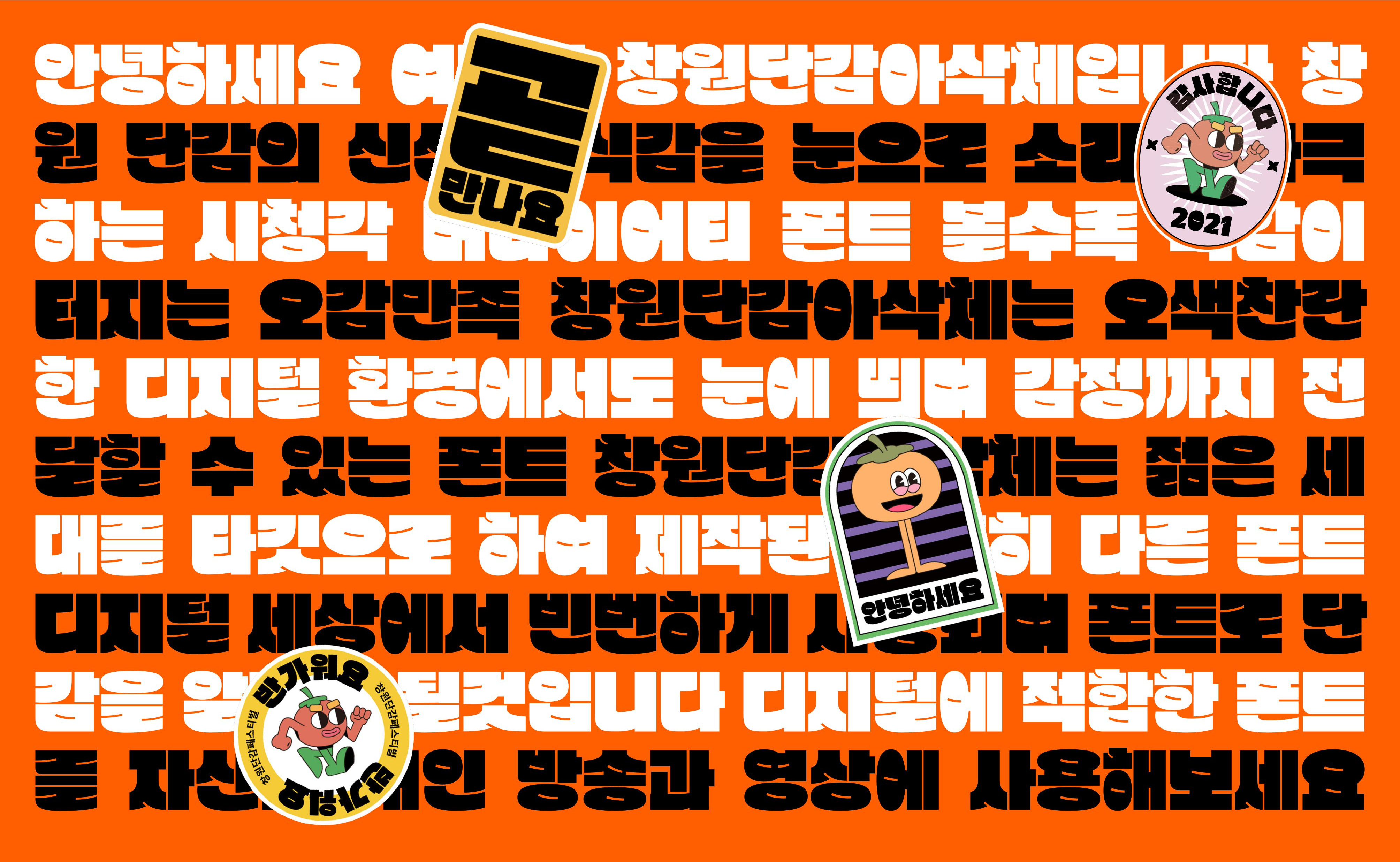 우리는 서체로 ‘창원’과 ‘단감’을 접목하여, 20대 서체 사용자의 일상 안에 ‘창원 단감’을 가져다 놓기로 했다. 그리고 그들의 타이포그래피 환경을 고려했다. 백지 위 균일한 텍스트 환경이 아닌, 오색찬란한 방송 화면 위에 사용되는 굵고 짧은 메시지. 이렇듯 20대 서체 사용자들이 익숙해 할 환경과 알맞은 디자인 체계를 구상한 것이다.