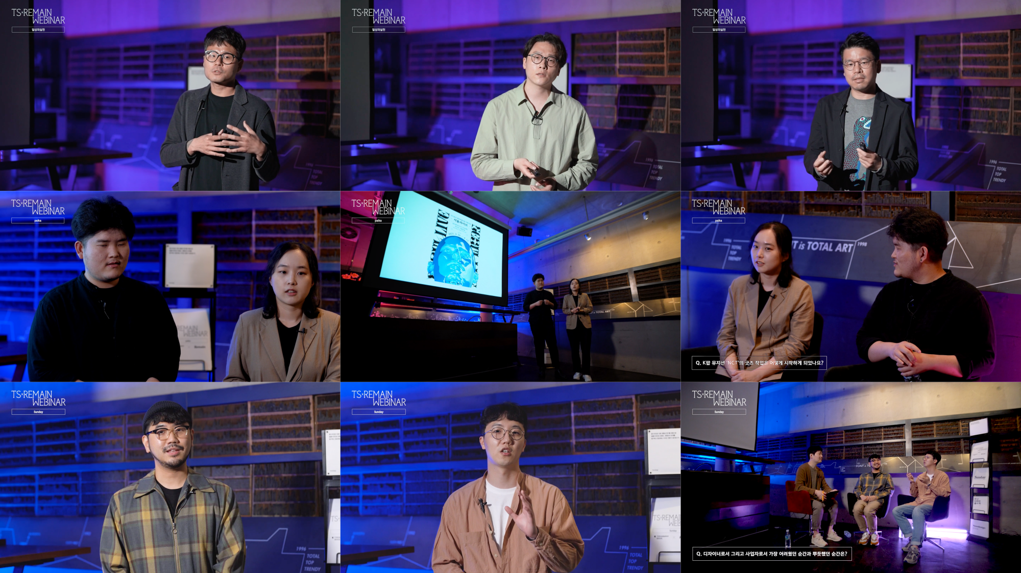 〈TS × Remain Webinar〉는 “요즘 디자이너들은 어떻게 일할까?”라는 궁금증과 함께 매달 새로운 디자인 스튜디오를 연사로 초청하여 ①실무 강연, ②『타이포그래피 서울』 에디터와의 디자인 토크, ③세미나 참여자들과의 질의응답 등으로 90~120분을 채웁니다. 일하는 방식도 디자인 스타일도 각기 다른 디자이너들. 이들의 멘토링을 VOD로 소장하여 여러분만의 ‘나다운’ 커리어를 업그레이드해보시기 바랍니다.