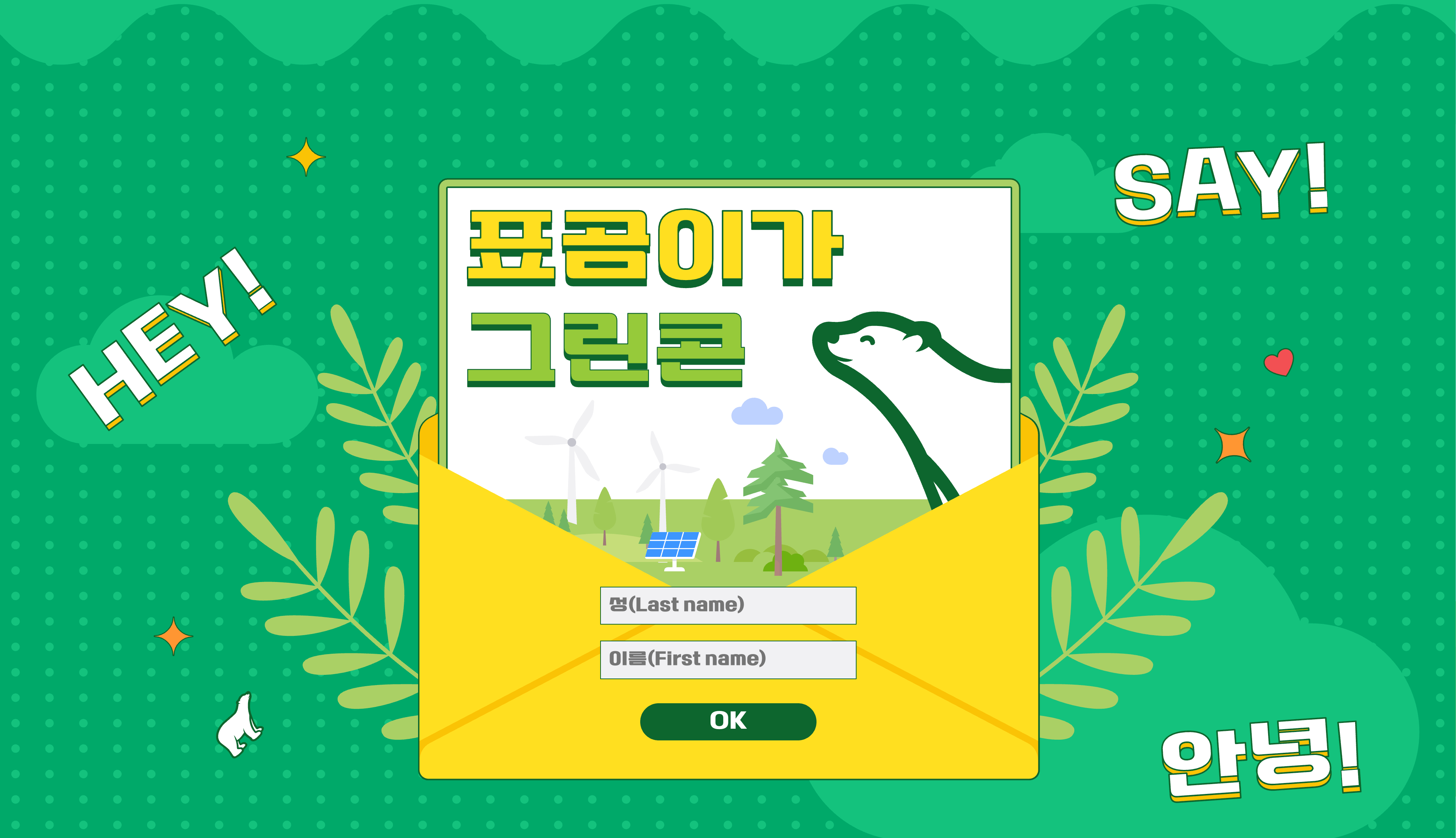 ‘더 늦기 전에, 지구를 위한 행동, 그린메시지 챌린지’라는 이름으로 탄소중립 및 지속가능한 사회 실현을 위한 메시지를 자유롭게 전송할 수 있는 캠페인이었다. 곰표 폰트 사이트에서 ‘그린콘(콘트)’을 다운로드해 SNS에 업데이트하는 방식. 친환경을 테마로한 열 가지 메시지에 문자를 커스터마이징하고 서로 주고받으며 유쾌한 친환경 수다를 나눠볼 수 있도록 제작했다.