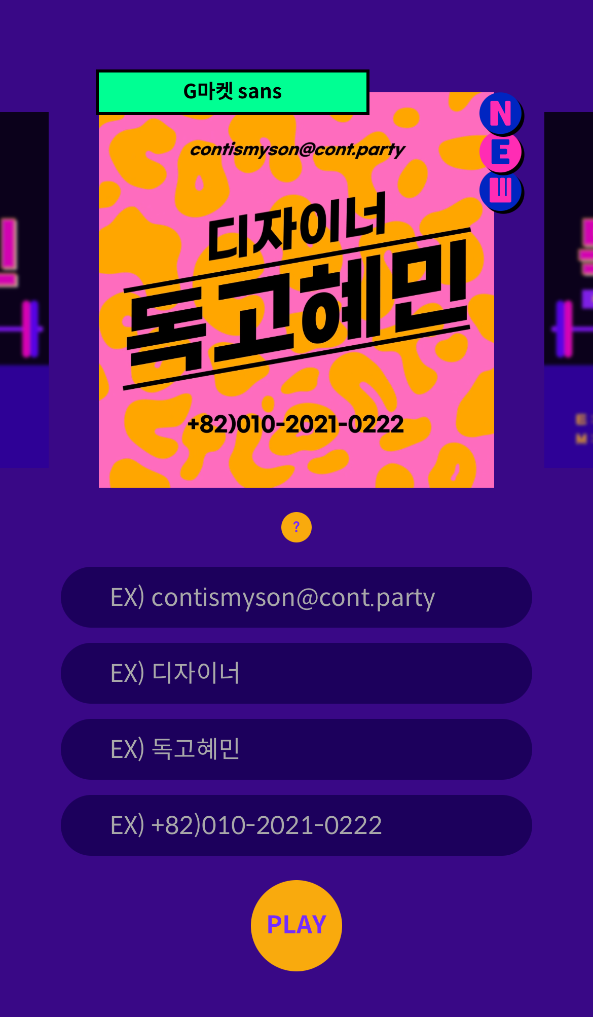 사용자가 쉽고 간단하게 제작할 수 있는 그림문자 서비스로 커스터마이징이 가능하다는 것이 특징이다. 콘트의 종류에 따라 이름, 날짜, 주소, 전화번호 등을 입력할 수 있어 상황에 맞추어 사용할 수 있도록 제작했다.