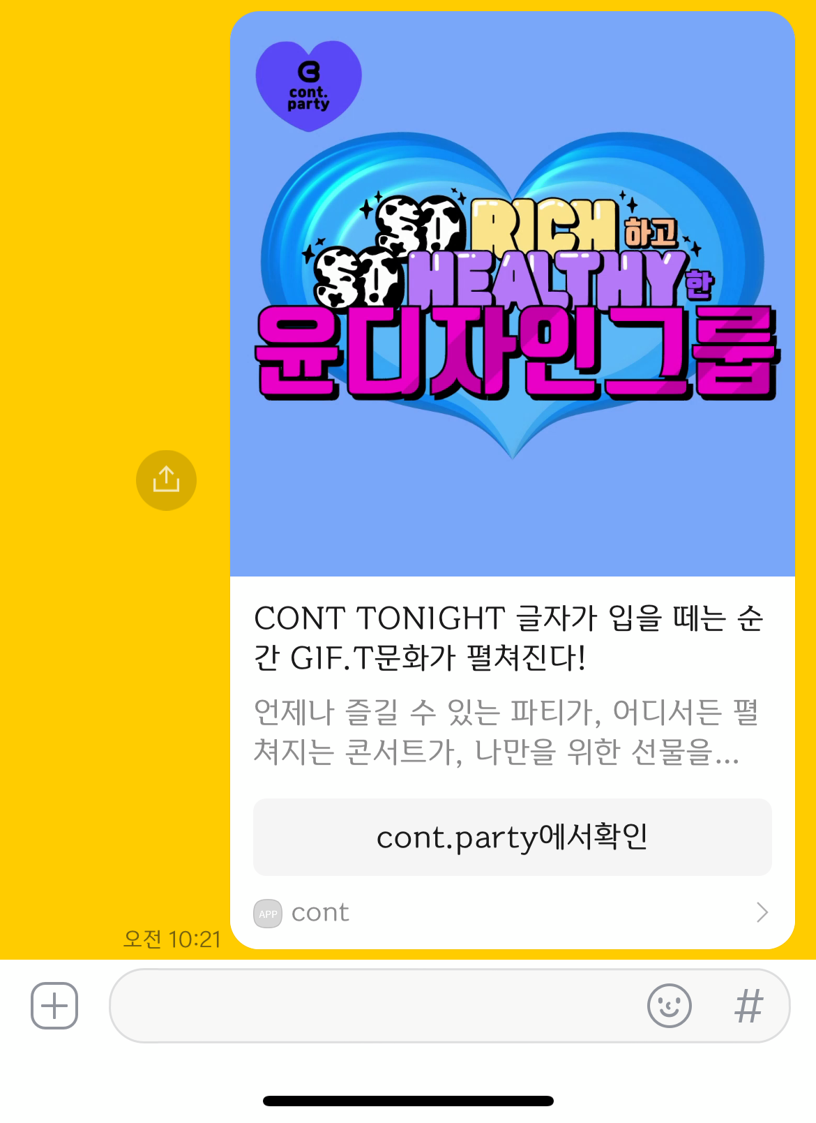 이미지화된 글자는 우리의 대화를 자유롭고 풍성하게 만들어 줄 것이다. 글자로 다른 방식의 소통을 만드는 것. 이것이 엉뚱상상이 상상하는 글자의 또 다른 역할 중 하나다. 현재 콘트 사이트(cont.party)에 모바일로 접속하면 콘트들이 당신을 반기고 있을 것이다. 커스터마이징하는 메시지콘, 티켓콘, 명함콘을 당신에게 보낸다.