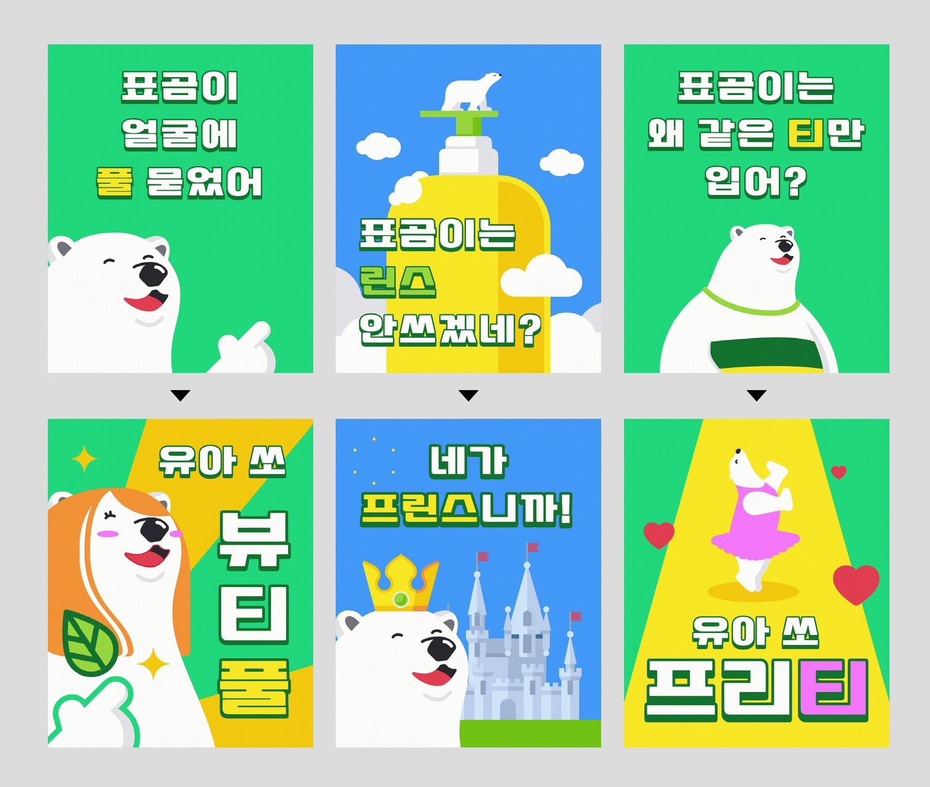 기본 이미지에 커스터마이징이 가능한 글자가 더해진 한 벌의 템플릿에는 액션 효과가 적용되어 있다. 폰트로 역동적이고 유쾌한 분위기를 자아내길 의도했다. 폰트 자체가 움직이면서 커뮤니케이션 파워가 더욱 커진다고 생각한다.
