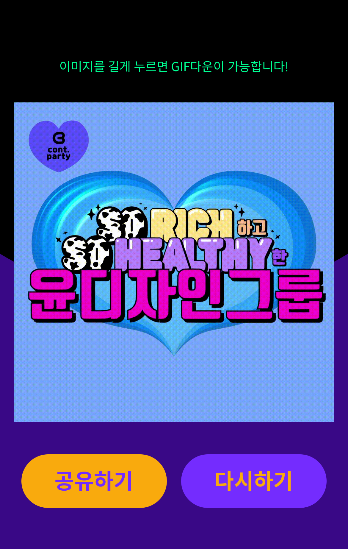 제작된 콘트는 내려받거나 공유할 수 있다. 공유하기를 누르면 카카오톡으로 연결되고 친구나 채팅창으로 바로 발신이 가능하다. 대화창에 이미지가 바로 뜨기도 하고, 콘트 사이트로 이동하면 다시 내려받거나 공유할 수 있도록 제작되었다.