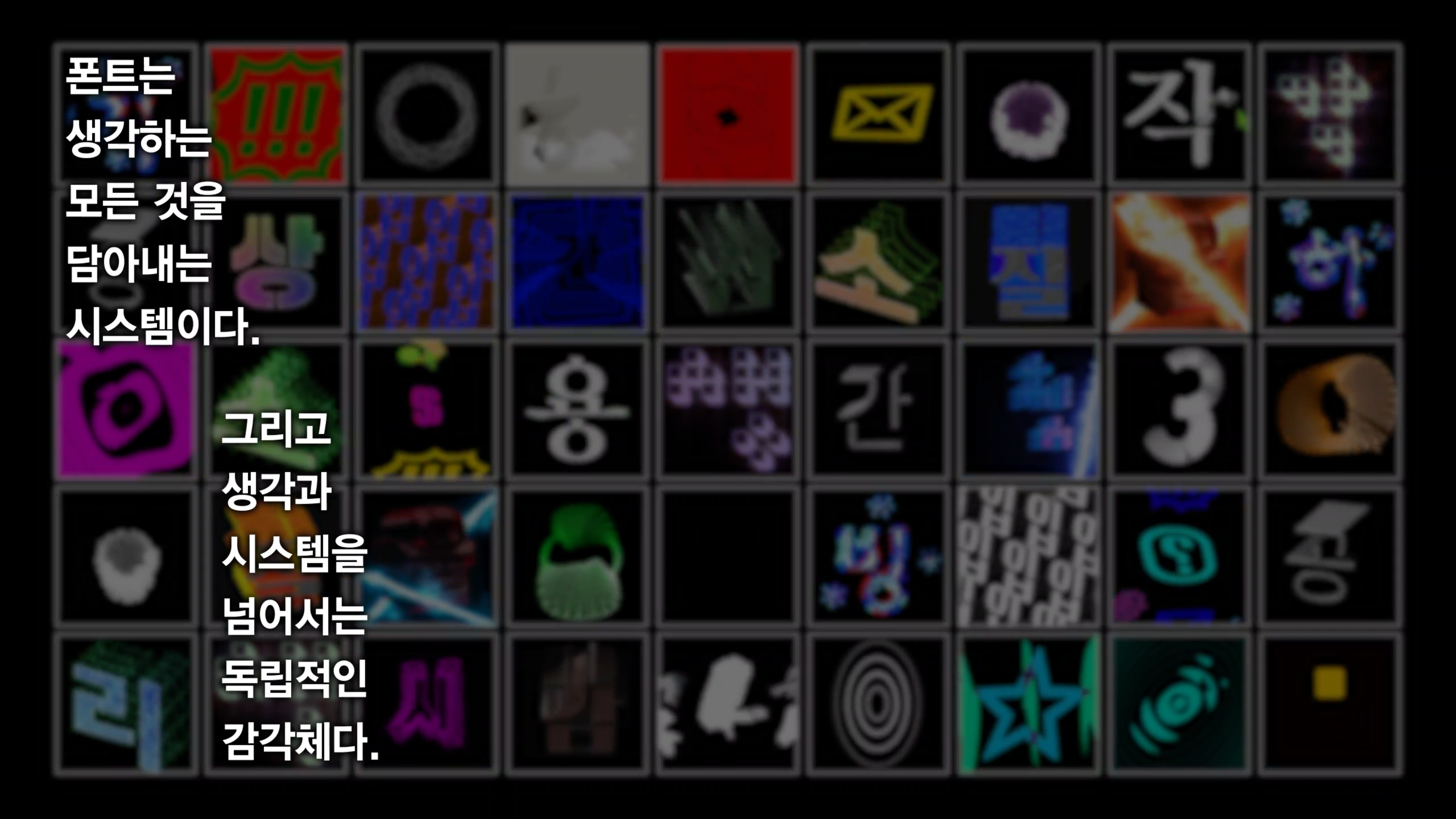 서체에 대한 새로운 시각을 만드는 일은 어려움이 있습니다. 서체를 기획할 때, 모두들 ‘가독성’을 중요하게 말합니다. 개인적인 생각으로는 문서, 신문, 책자에서는 서체의 중요한 역할을 ‘가독성’으로 보고 있습니다. 그리고 기성세대가 서체를 사용하던 미디어 역시 ‘가독성’이 중요한 인쇄 매체가 중심이었기 때문에, 자연스럽게 가독성이 서체에 가장 중요한 포인트로 이야기되어온 것으로 보입니다. 그러나 오늘날 서체를 사용하는 미디어가 바뀌고 있습니다. 영상물에서 필요한 서체는 과연 ‘가독성’일까요? 우리는 가독성이 좋은 폰트가 아닌, 짧고 임팩트 있는 메시지를 던질 수 있는 서체를 만들어야 한다고 생각했습니다. 가독성과 임팩트는 상반되는 개념으로 두 가지를 다 가져갈 수 없기 때문에 고민이 되었습니다. 그동안 생각을 환기하는 시간이 필요했고, 다시 한 번 서체를 사용하는 방식에 대해서 생각해보게 되었습니다. 몇 가지 설문조사를 해봤고, 아이러니한 데이터로 유추할 수 있었습니다. 서체를 말할 때 누구나 가독성이 중요하다고 말하지만, 어떤 서체를 사용하는지 살펴보면 ‘개성 있는’ 서체였습니다.