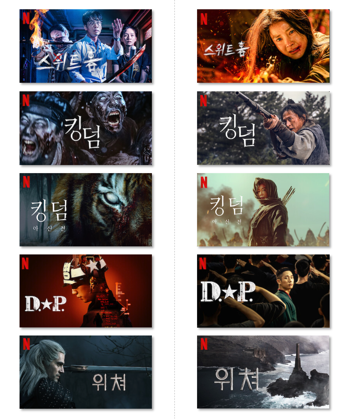 〈스위트 홈〉과 〈위쳐〉의 섬네일도 인상적이에요. 왼쪽 열에선 무기(칼)가 노출되어 있습니다. 〈스위트 홈〉의 경우는 심지어 피 묻은 칼이 딱 보이네요. 왠지 고어물일 것 같은 냄새(?)도 풍깁니다. 하지만 오른쪽엔 배우 이시영의 얼굴이 부각되어 있어요. 입가엔 피가 흐르고 손에는 무기도 쥔 것 같은데, 이러한 폭력성이 좌측 열의 섬네일만큼 전면에 노출되진 않았습니다. 〈위쳐〉는 뭐 긴말할 것도 없겠네요. 장검을 겨누고 있는 배우 헨리 카빌의 모습(좌측 섬네일), 그리고 풍경 사진을 연상케 하는 바다 위 구조물(우측 섬네일). 한눈에 봐도 대조적입니다.