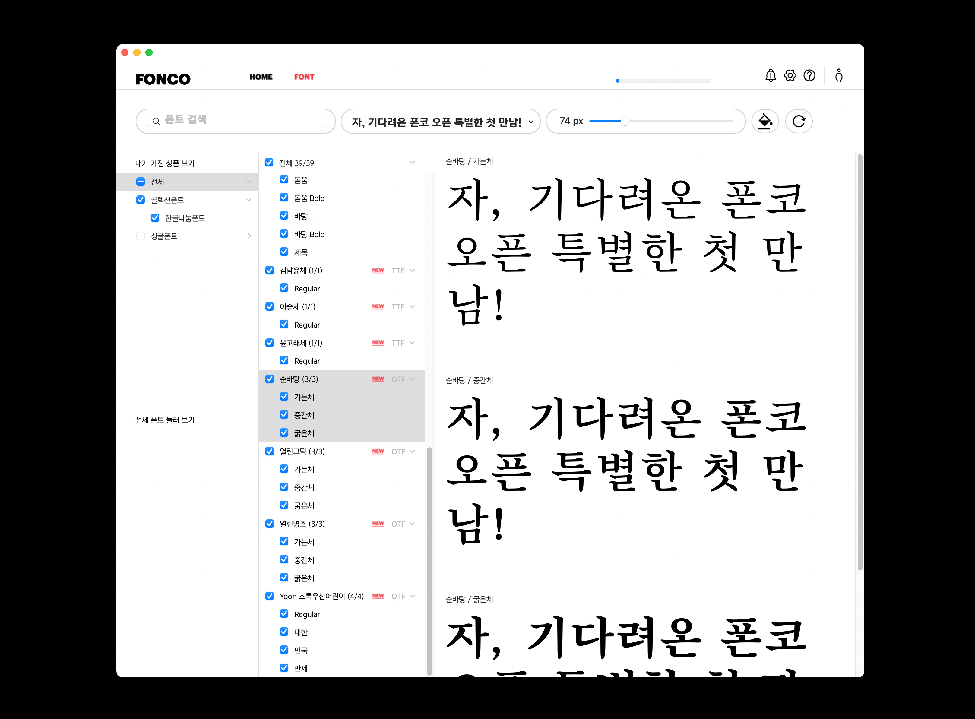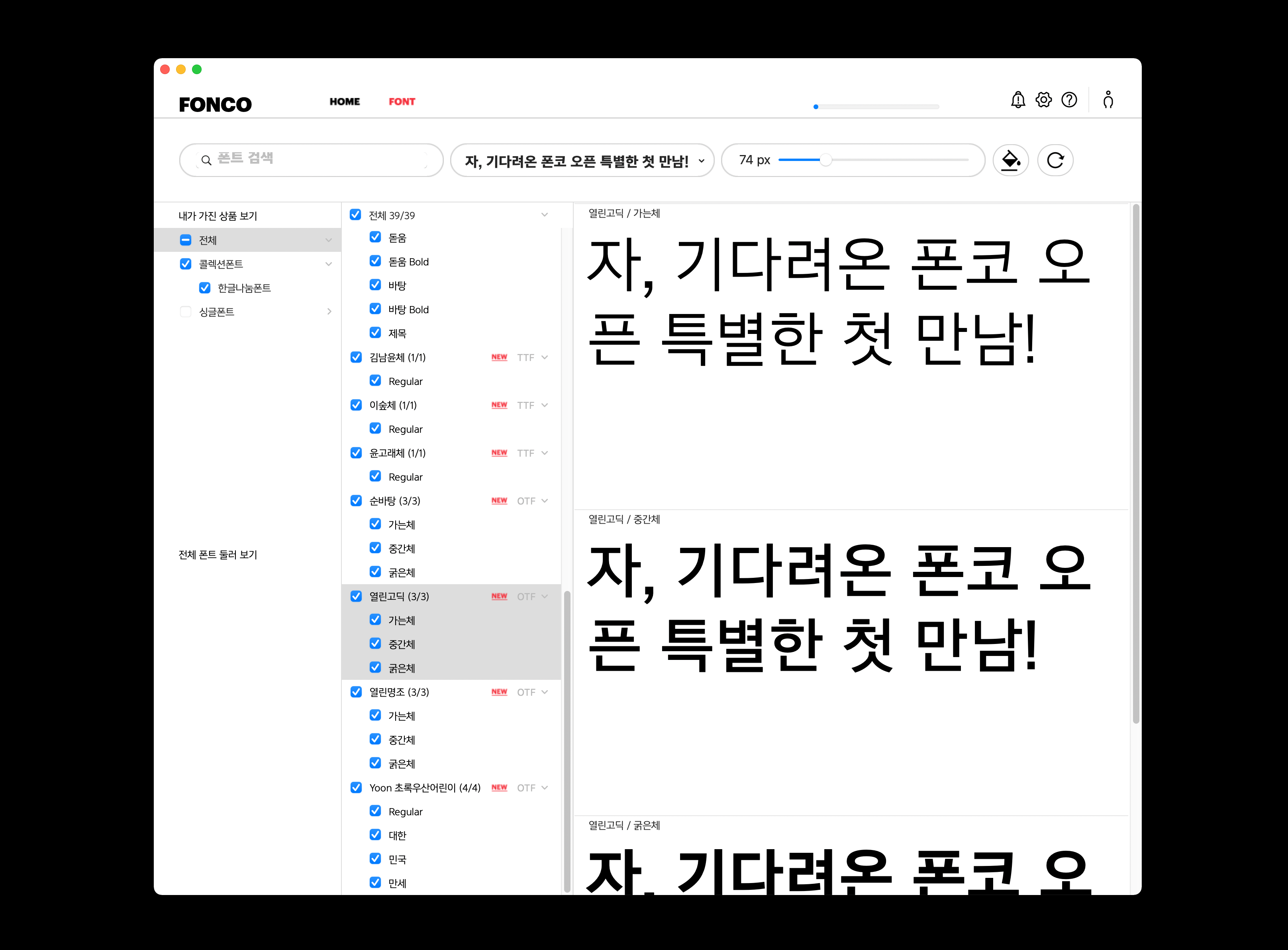 윤디자인그룹의 폰트 클라우드 서비스 ‘윤멤버십’. 지금은 폰트 매니저 프로그램을 통해 윤멤버십 폰트들이 활성화되고 있습니다. 폰트 매니저는 말 그대로 여러분의 디바이스에 폰트들을 불러오는 ‘관리 도구’ 역할을 수행하는데요. 폰코 시즌 2에선 한 가지 기능이 더 추가됩니다. ‘폰트 쇼룸’ 공간이 생기는 거죠.