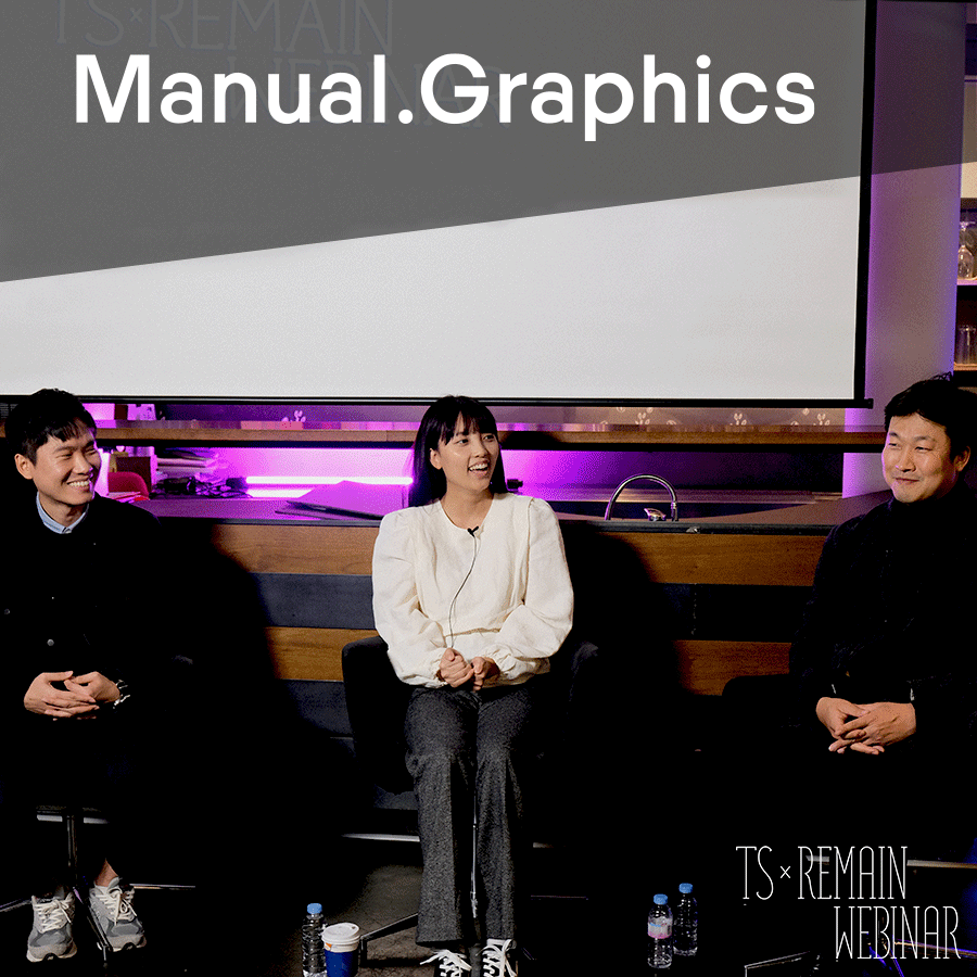 매뉴얼 그래픽스(Manuale.co.kr)의 〈TS × Remain Webinar〉는 지난 1~6회와 다소간 차별화된다. 연사들의 면면과 강연 구성 때문이다. 스튜디오 설립자이자 아트디렉터인 이성균 디자이너, 그래픽 디자인 업무를 맡고 있는 정예지 디자이너, 그리고 이한연 포토그래퍼가 연사로 나선다. 또한 매뉴얼 그래픽스는 여러 프로젝트들을 소개하는 대신, 한 가지 대표 프로젝트를 선정하여 ㄱ부터 ㅎ까지 전 과정을 해부하듯 펼쳐 시청자들에게 공개한다. 클라이언트와의 킥오프 미팅부터 산출물 사진 촬영에 이르는 모든 단계들을 보여준 것이다. 여기에 더하여, 이성균 디렉터는 매뉴얼 그래픽스가 지향하는 디자이너의 모습(이를테면 ‘인재상’)을 설명한다. 일면 채용 설명회(?)처럼 보일지 모르나, 그의 강연은 이제 막 사회 생활을 시작하는 루키 디자이너들에게 더할 나위 없는 ‘꿀팁’(!)―예를 들면 ‘디자이너가 피해야 할 이력서/자기소개서 양식’ 같은 내용―이다. 또한, 스튜디오 소속 포토그래퍼의 존재 의미와 실제 과업, 그리고 디자이너들과의 협업 체계를 이렇듯 상세히 소개한 콘텐츠는 〈TS × Remain Webinar〉가 유일할 것이다.