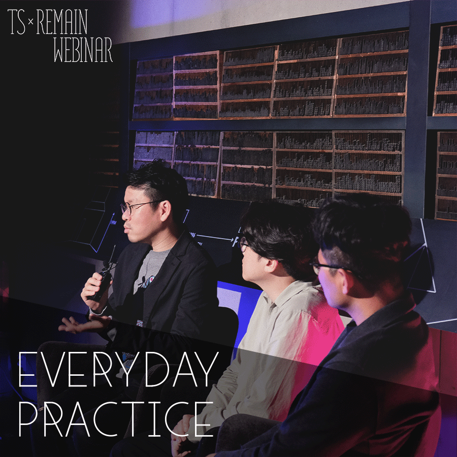 일상의실천(everyday-practice.com)의 작업은 크게 그래픽, 웹, 설치 등 세 가지로 범주화할 수 있다. 〈TS × Remain Webinar〉에서 일상의실천 권준호·김경철·김어진 디자이너는 이 세 개 범주에 해당하는 몇 가지 프로젝트들의 진행 과정을 공개한다. 권준호는 설치, 김경철은 웹, 김어진은 그래픽, 이렇게 ‘1인 1카테고리’ 강연을 준비한 것이다. 초기 아이데이션 단계부터 작업 주제 및 표현 방식 설정, 시안 제작, 어플리케이션 파생, 최종 산출물 완성까지 제작 과정 전체를 방대한 시각 자료와 함께 설명한다. 평소 일상의실천 작업을 관심 있게 지켜봤던 분들이라면, 〈TS × Remain Webinar〉 일상의실천 편 VOD는 소장 욕구를 자극하는 ‘스페셜 피처’처럼 귀중할 것이다.