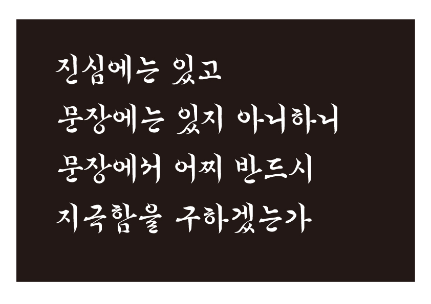 글자(typeface)는 주로 ‘꼴’에 관하여 이야기됩니다. 글자가 품평의 대상이 될 때 그 근거는 대개 꼴의 완성도입니다. 인격이 피지컬과 멘탈의 총합으로 구성되듯, 어쩌면 글자도 그러한 겉과 안의 본연한 아름다움이 있지 않을까 상상해봅니다. 사람의 신체와 글자꼴(글자의 모양)이 조응한다면, 사람의 멘탈에 해당하는 글자의 요소는 무얼까, 또 상상하다가 이렇게 답을 내리기로 합니다. 글자를 그리는 디자이너의 태도.