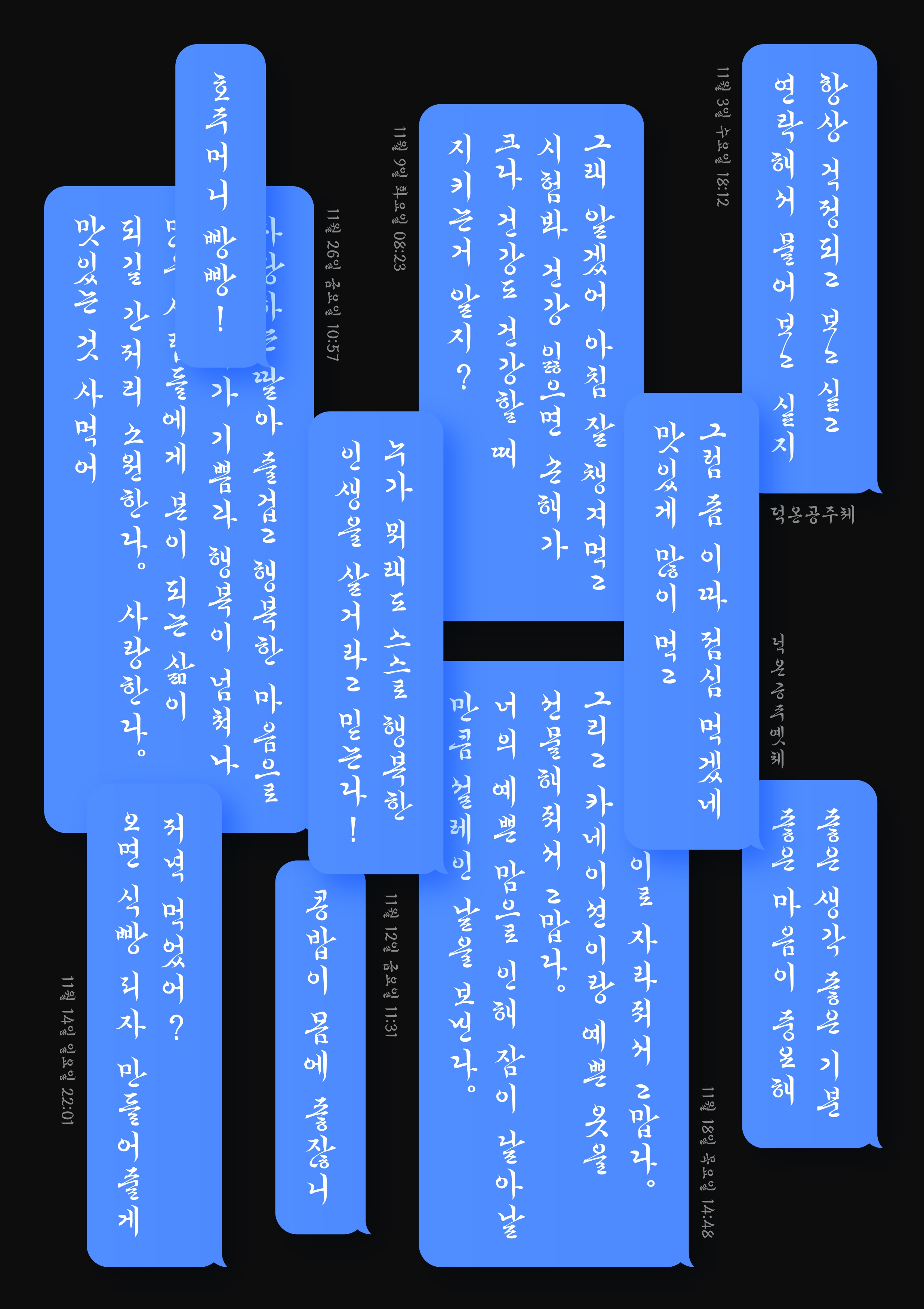 작업이 점차 진척됨에 따라 글자의 형태가 익숙해지고, 그러다 어느 순간 문장이 막힘 없이 술술 한눈에 읽힐 때 무척 뿌듯하더라고요. 그리고 세로쓰기 흘림에는 한글의 ‘연결쓰기’도 존재하거든요. 알파벳에 합자(Ligature)가 있듯 세로쓰기용 폰트에서 연결글자를 표현할 수 있도록 개발한 점이 좋았어요.