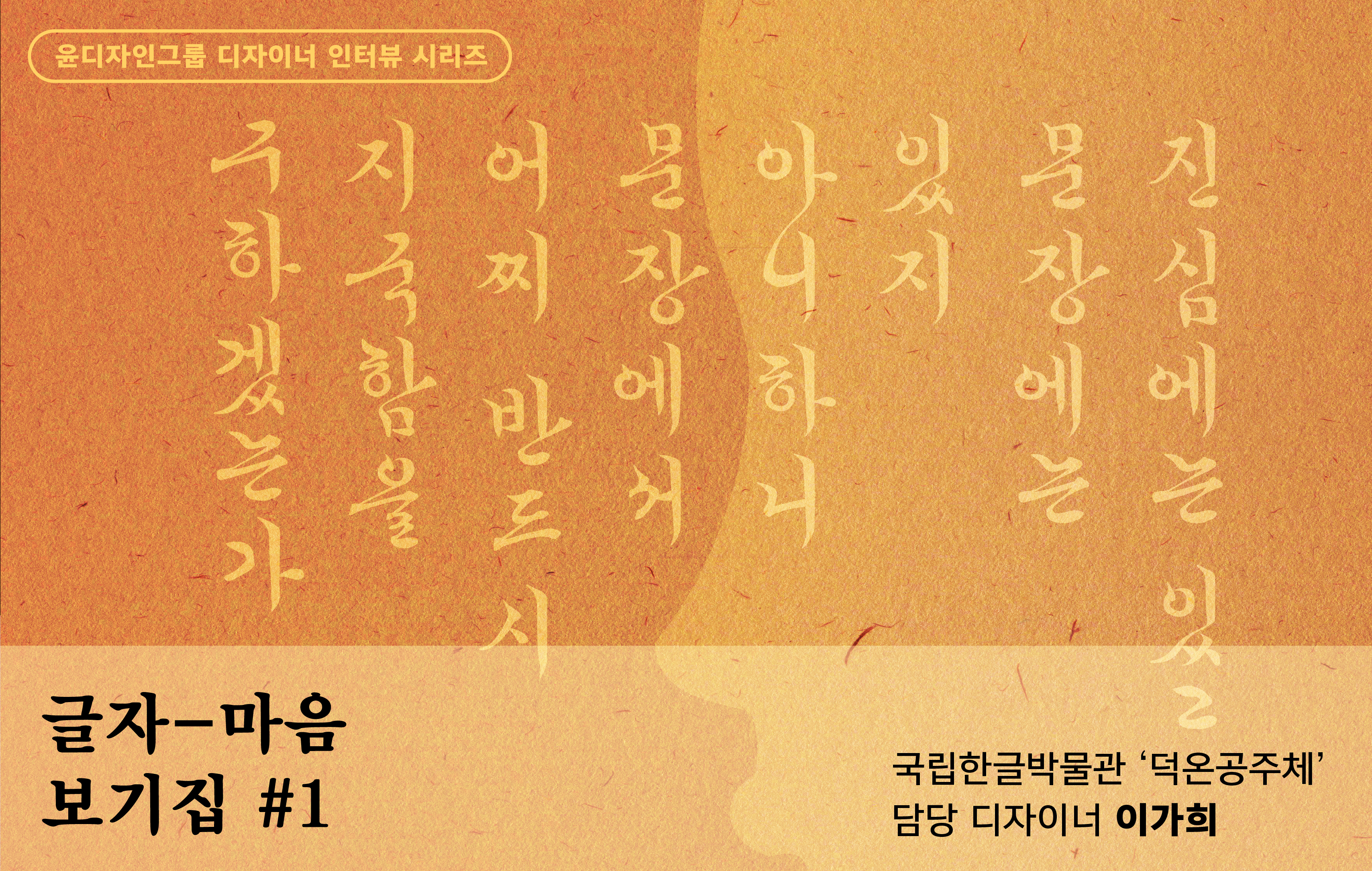 시리즈명이 [글자-마음 보기집]이고 ‘디자이너 인터뷰’를 표방하지만, 디자인 직종 외의 직원들도 이 시리즈에 (자주는 아니겠지만) 등장할 예정입니다. 윤디자인그룹이 글자를 근간으로 하는 기업인 만큼, 디자이너가 아닌 많은 직원들도 결국은 글자와 직간접적으로 연결되어 각자의 직무를 수행합니다. 즉, 그들의 마음과 결 또한 [글자-마음 보기집]에 수록되어야겠지요.