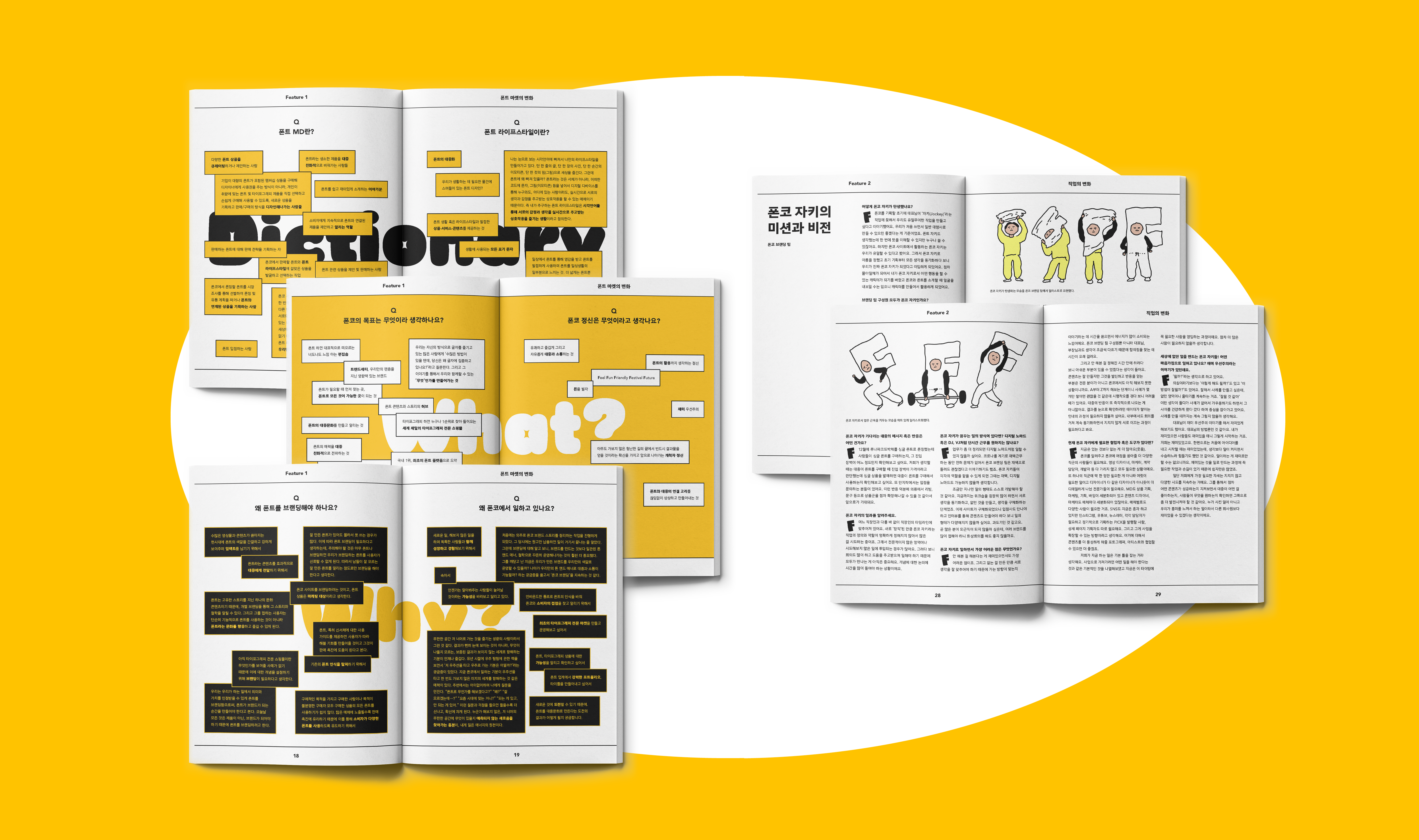 《the T》 제15호의 제목은 「폰코, 폰트 마켓의 변화를 만들다」입니다. 폰트 마켓을 넘어 ‘폰트 문화 플랫폼’, ‘폰트 라이프스타일 플랫폼’을 지향하는 폰코 2.0의 비전을 함축한 문장인데요. 이 제목을 든든히 받치고 있는 다섯 가지 피처 기사와 하나의 인터뷰 꼭지를 살펴보겠습니다.