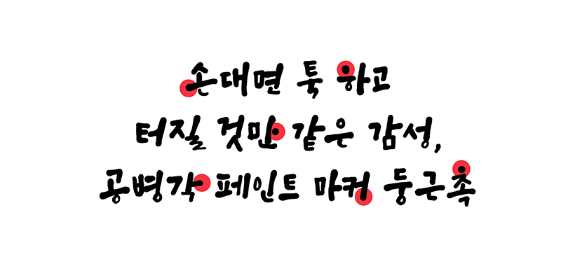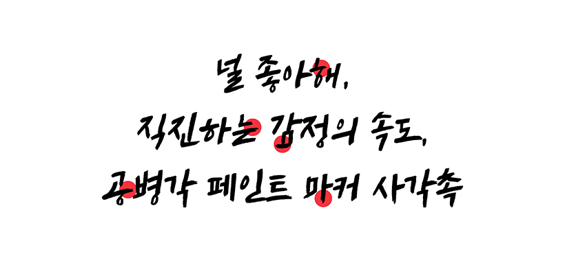 촉 끝만 바뀌었을 뿐인데, 이렇게나 다른 폰트가 완성되었어요. 단번에 쓴 느낌을 자아내는 페인트 마커 사각촉의 거침없는 에너지를 담은 폰트입니다. 있는 그대로의 솔직함, 마음의 직진을 표현하기에 좋지요.