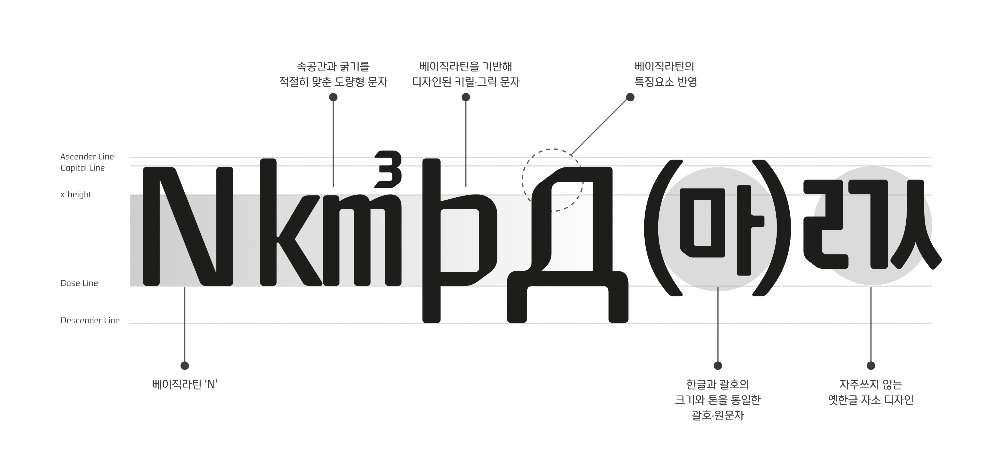 · · · 이현승 한글과 영문 간 균형을 맞추는 데 주력해 가독성과 시안성을 개선하는 것이 목표였어요. 짜임새 있는 글자폭과 자간으로 사용자가 별도의 장평이나 자간 조정 없이 사용할 수 있었으면 했고, 모임꼴 각각 안정적이고 정돈된 글줄이 형성되도록 설계했습니다. 한글뿐 아니라 KS심볼도 디자인했는데 한글과 영문, 기호를 섞어 쓸 경우 균형감 있게 보이도록 새롭게 만들었어요. 한글과 영문에 입각한 특징 요소들이 통일감 있게 반영되도록 했고요.