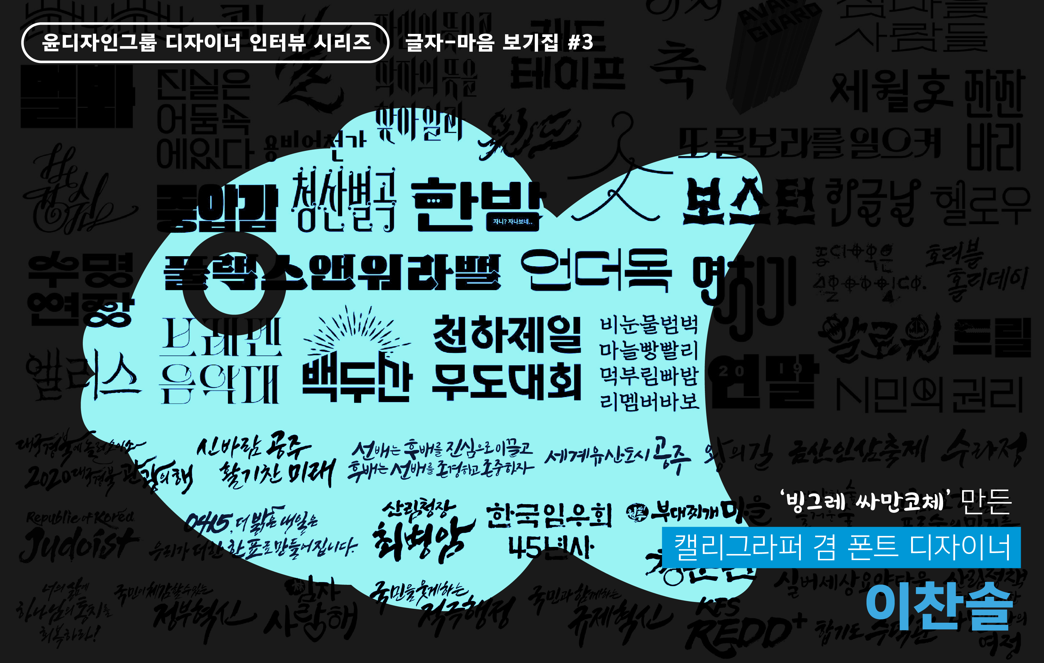 언젠가 디자이너 이찬솔의 개인 폰트를 출시할 수도 있겠지만, 윤디자인그룹 소속인 상태로 개인 폰트를 따로 준비하려는 마음은 없어요. 아직은 회사 안에서 다양한 프로젝트들을 진행해보는 것이 재미있고, 무엇보다도 개인 폰트를 선보일 만큼 실력이 올라오지 않은 상태라서요. 하지만 레터링 작업은 꾸준히 할 계획입니다.