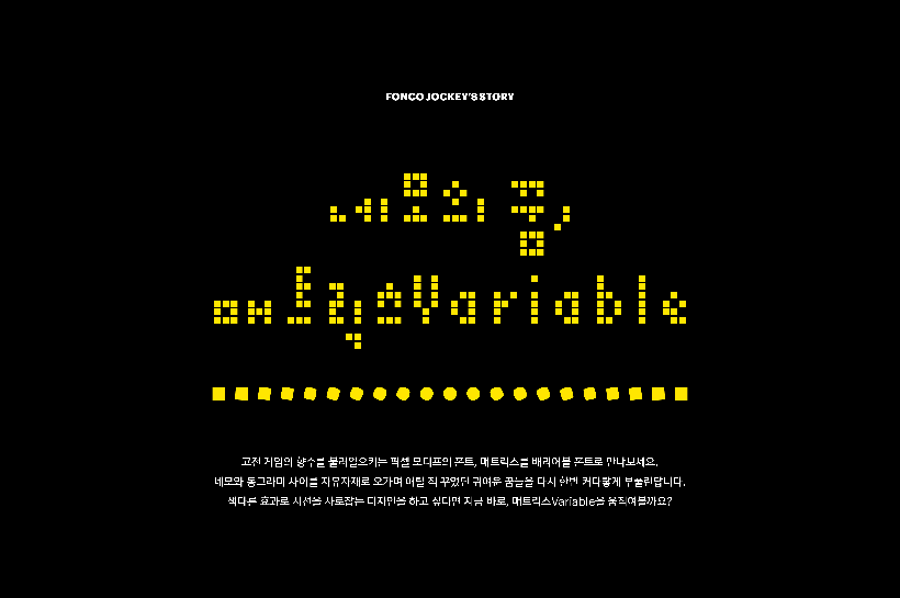 윤디자인그룹의 폰트 마켓, 폰코(FONCO)에 배리어블 폰트 3종이 업데이트 되었습니다. 바로 「윤고딕 700 Variable」, 「매트릭스 Variable」, 「머리정체2S 바이올렛 Variable」이 그 주인공이죠. 배리어블 폰트(Variable Font, 가변글꼴)란 글자의 굵기, 인라인과 세리프 등을 사용자가 직접 변형하여 쓸 수 있도록 활용성을 높인 폰트인데요, 과연 이번에 새로 업데이트 된 3종은 어떻게 배리어블할지 지금 살펴보세요.