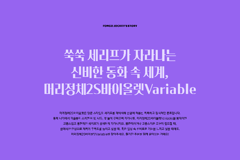 영문 스타일의 세리프를 재해석해 한글에 적용한 독특하고 장식적인 폰트인 「머리정체2S 바이올렛」이 배리어블 폰트로 거듭났어요. 움직임에 따라 고풍스럽고 몽환적인 세리프가 섬세하게 자라납니다. 몽환적이거나 고풍스러운 표현이 필요할 때, 클래식한 인상으로 제목의 주목도를 높이고 싶을 때, 「머리정체2S 바이올렛 Variable」을 찾아주세요!