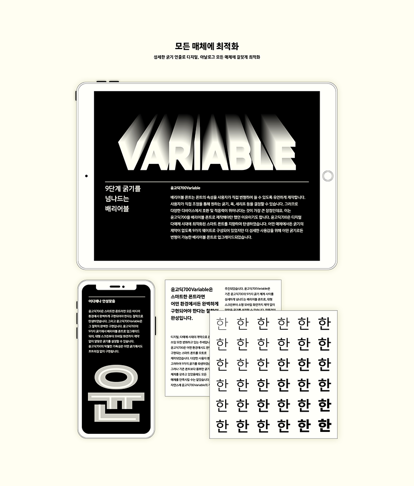 다양한 매체의 본문과 제목에 두루 활용할 수 있는 「윤고딕 700」을 배리어블 폰트로 선보입니다. 모던한 710과 힘 있는 790 사이를 자유자재로 오가고, 굵기에 따라 최적화되어 있는 가독성과 판독성을 유지하며, 섬세한 굵기 연출로 디지털, 아날로그 모든 매체에 걸맞게 최적화할 수 있죠. 「윤고딕 700 Variable」로 언제, 어디서나 내가 원하는 굵기를 연출하는 기쁨을 누려보세요.