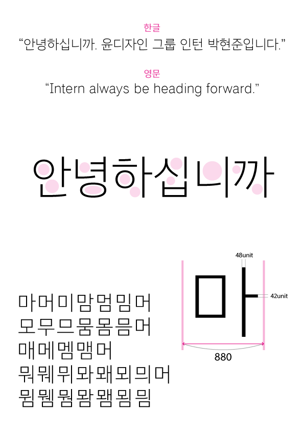 윤디자인그룹에 인턴으로 입사하면 ‘인턴 과제’라는 걸 해야 하는데요. 자유 주제로 기획과 콘셉트를 잡고 자기 글자를 만드는 거예요. 제 인턴 과제 결과물은 [인턴고딕]이라는 본문용 고딕체였습니다. 차장님과 과장님, 동료와 선배 모두 쉽지 않을 거라는 반응들이었어요. 그래도 하지 말라고는 안 했습니다.(웃음)