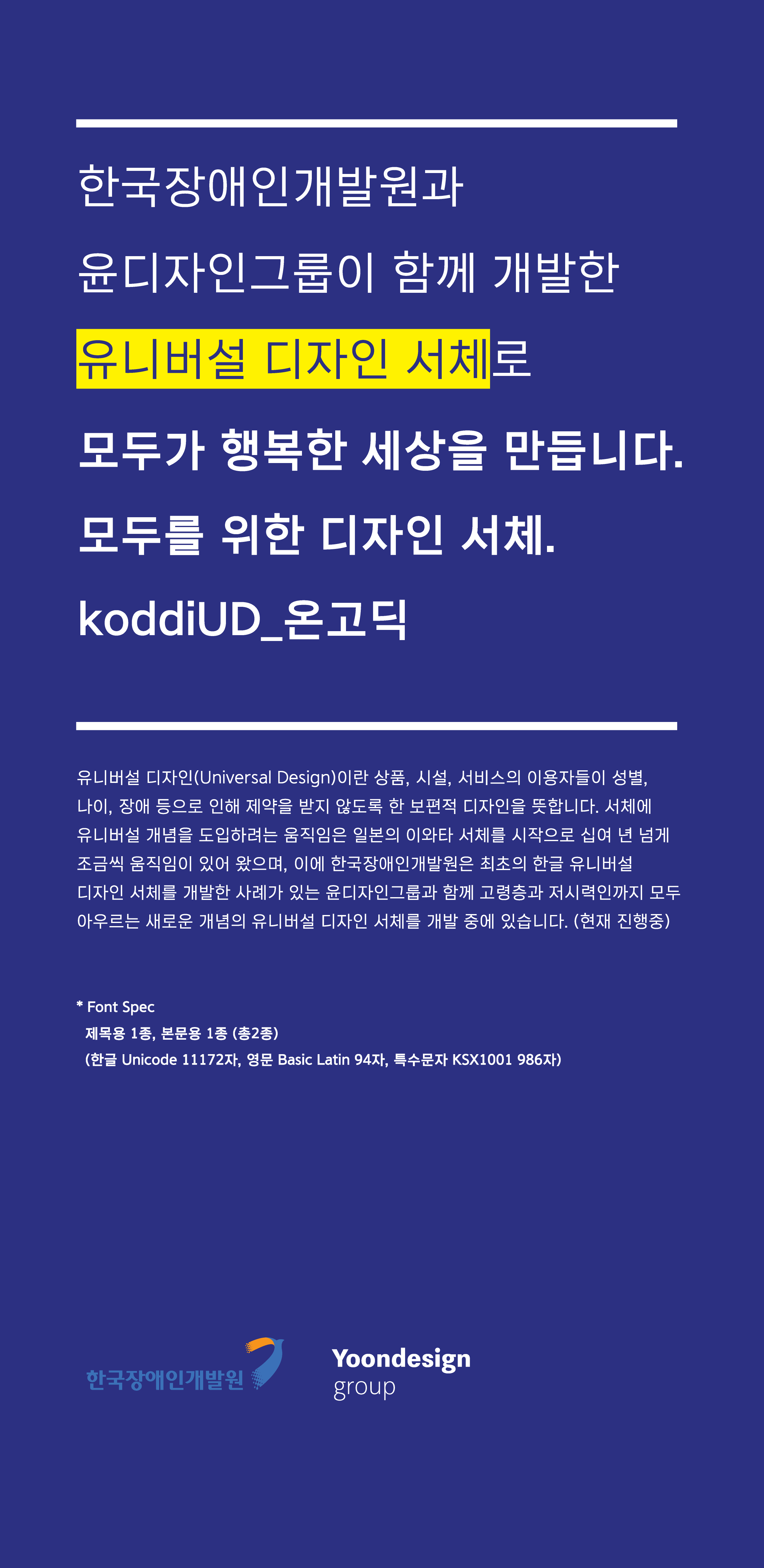 [KoddiUD 온고딕] 서체는 가장 기억에 남는 작업이에요. 2021년 4월 20일 ‘제41회 장애인의 날’ 기념으로 한국장애인개발원(Korea Disabled people’s Development Institute, KODDI) 사이트에서 최초 공개 및 무료 배포된 서체입니다. 한국장애인개발원의 ‘유니버설디자인환경부’와 윤디자인그룹이 공동 개발했고, 2020년부터 본격적으로 이 프로젝트를 진행했어요. 실무자였던 저에게는 여러모로 뜻깊었던 작업입니다.