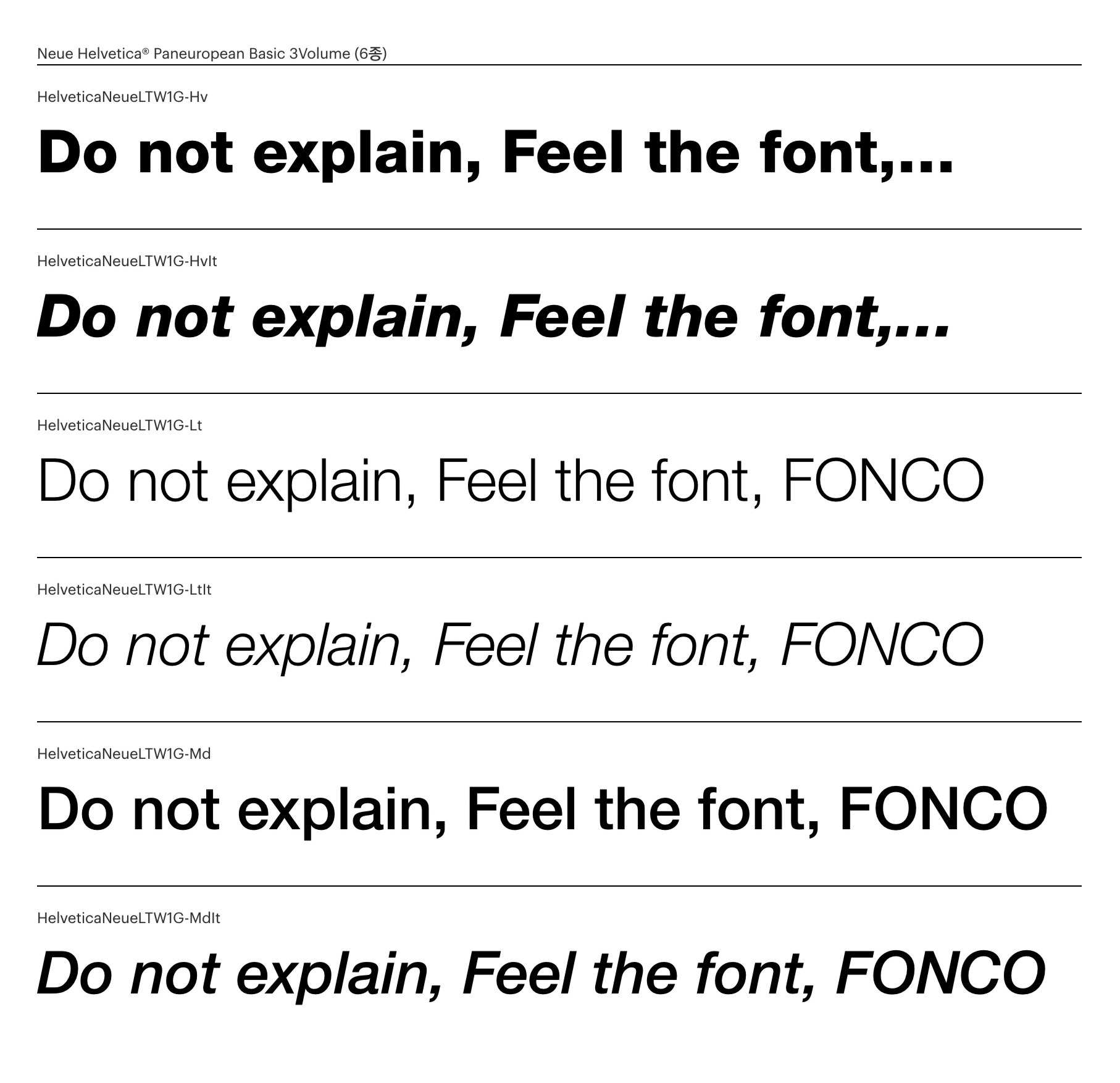 이상하게 저는 [헬베티카(Helvetica)]로 조판된 디자인을 보고 있으면 원인 모를 카타르시스를 느껴요. ‘카타르시스(catharsis)’의 사전적 의미가 ‘정화’와 ‘배설’이라는데, 제가 [헬베티카]에 대해 갖는 정서가 딱 그렇습니다. 뭔가, 몸안이 편안해지고 마음이 안정되는 느낌···. 여러 매체에서 여러 디자이너들이 언급했던 표현처럼 공간감·균형감·곡선감의 완성도, 특히 군더더기 없는 인상 때문인 것 같아요. [헬베티카]의 무색무취한 중립적 인상이 일면 평범해 보이기도 하지만, 제 눈에는 이게 궁극의 경지처럼 다가오더라고요. 폰트 디자이너로서 꼭 다다르고 싶은 어떤 미지의 세계랄까요.