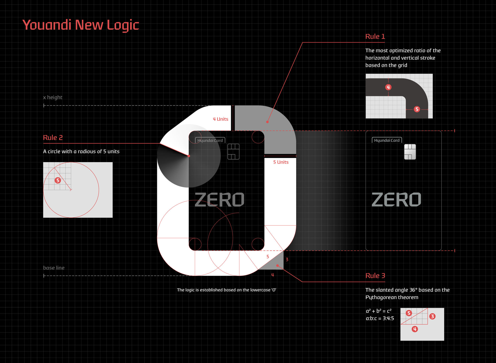 유앤아이 서체의 외형은 현대카드 플레이트(plate, 신용카드의 몸체를 가리키는 말)를 디자인 모티프로 취한 것입니다. 현대카드는 신용카드의 목적과 서비스 유형 등에 따라 다채로운 플레이트 디자인을 적용하는 브랜딩 전략을 구사하고 있어요. 실물 신용카드 자체가 디자인 소품에 버금가는 ‘멋쁨’을 연출하는데요. 이러한 디자인 다양성은 어느새 현대카드 고유의 아이덴티티로 자리잡았죠.