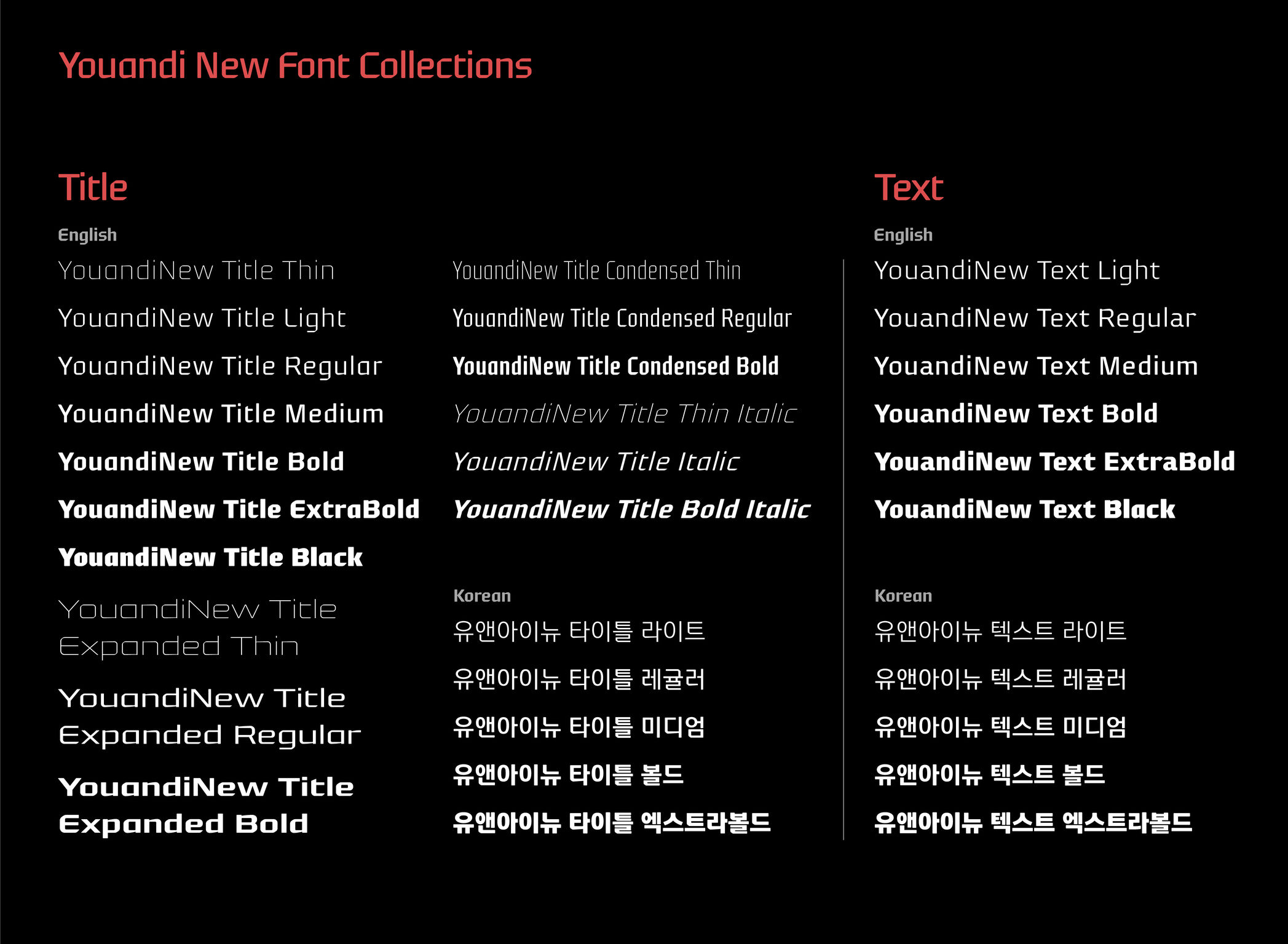 이런 과정을 거쳐 유앤아이뉴는 유앤아이 모던보다 대폭 확장된 패밀리(라틴 알파벳 21종 및 한글 10종), 그리고 여기에 국내 기업 전용서체 최초로 베리어블까지 포함한 구성으로 최종 완성되었습니다.