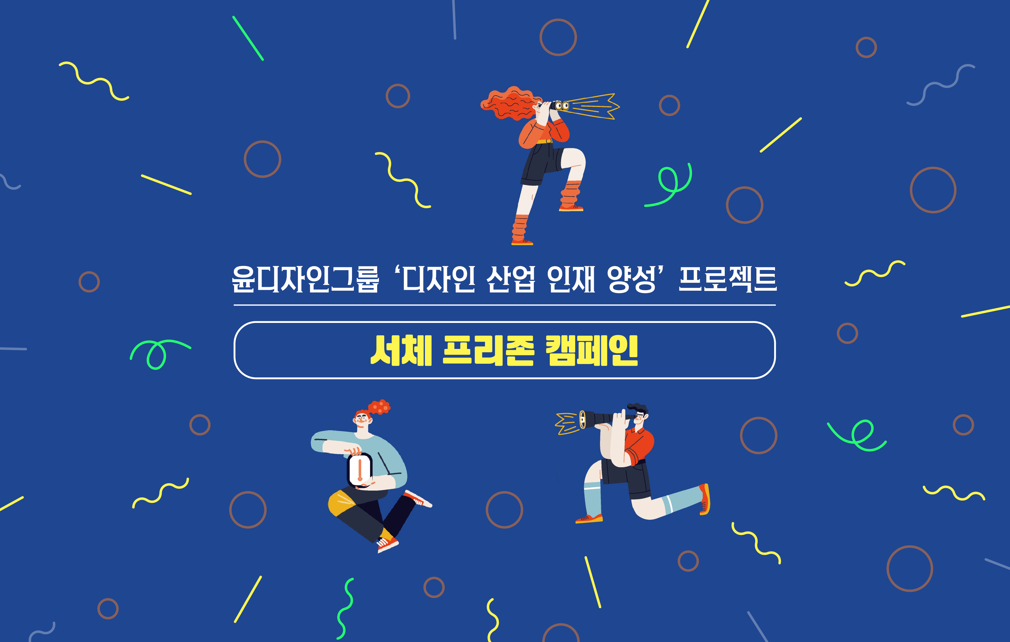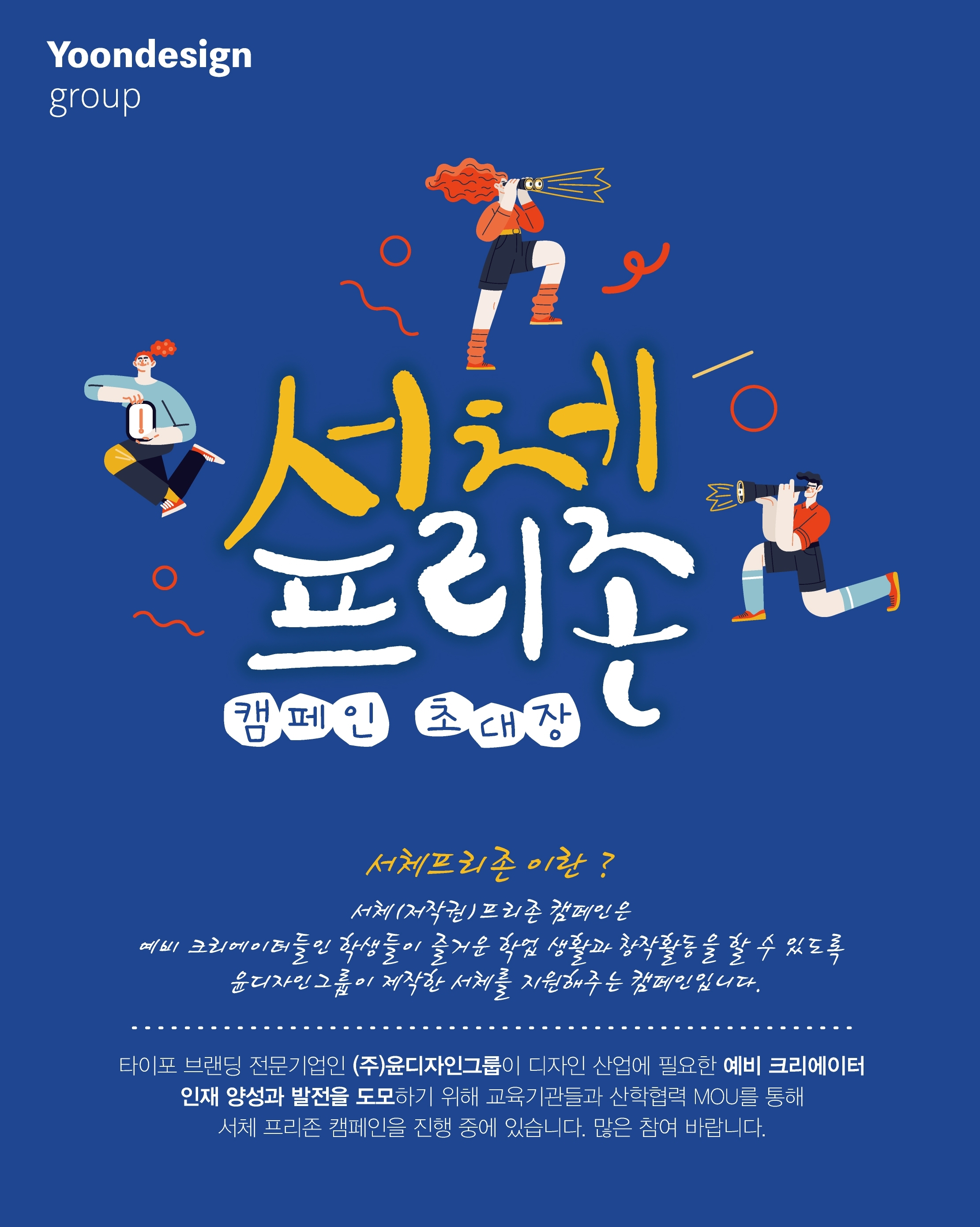 윤디자인그룹이 디자인 산업 인재 양성을 위한 산학협력 프로젝트를 시작했습니다. 바로 [서체 프리존 캠페인]! 윤디자인그룹 서체를 교육 콘텐츠 크리에이터 및 학생들에게 제공하고, 이를 통해 안전한 저작물 이용 환경과 역량 있는 크리에이터의 성장 발판을 조성하는 사업입니다.