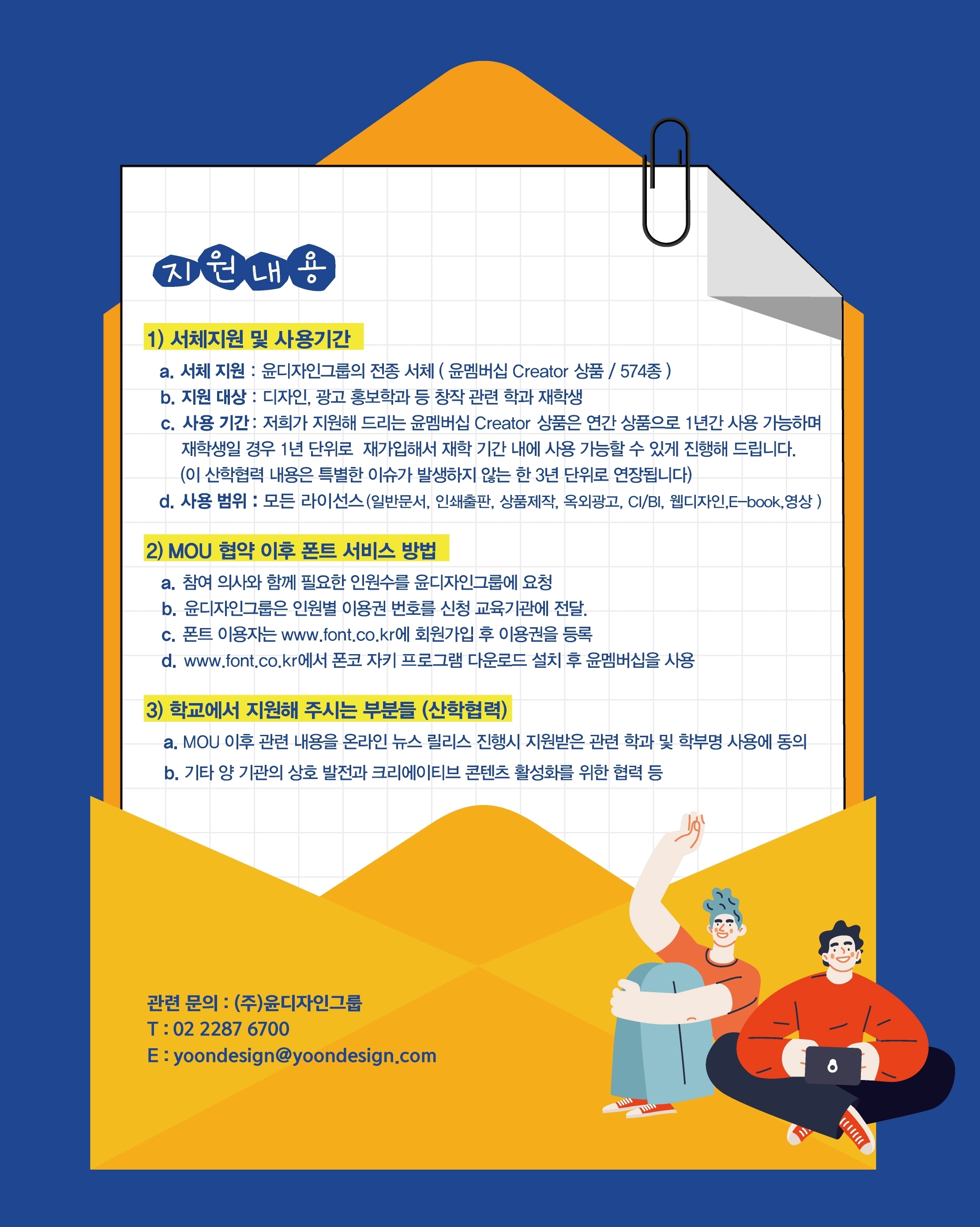 [서체 프리존 캠페인]의 일환으로 윤디자인그룹은 국내 대학교들과 산학협력 MOU를 체결하고 있는데요. 이화여자대학교 조형예술대학(5월 25일 체결), 국민대학교 조형대학(6월 8일 체결)을 시작으로 점차 전국의 모든 학교와 산학협력을 진행해 나갈 계획입니다.