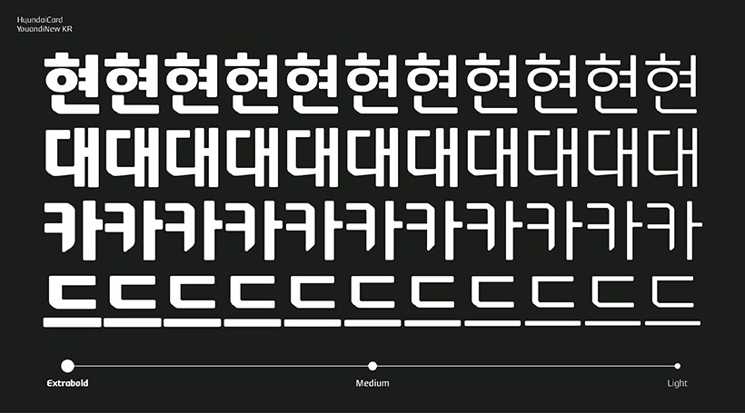 2003년 발표된 「현대카드 유앤아이」는 국내 최초의 기업 전용서체로서 ‘서체를 활용한 기업 브랜딩’ 시대를 연 기념비적인 결과물이에요. 이후 리뉴얼을 거쳐 2013년 「현대카드 유앤아이 모던」, 2021년 「현대카드 유앤아이뉴」를 선보였죠. 리뉴얼로 재정립된 라틴 알파벳 디자인 로직을 바탕으로, 윤디자인그룹은 한글 서체를 개발하고, 배리어블 제작 구현을 담당했습니다.