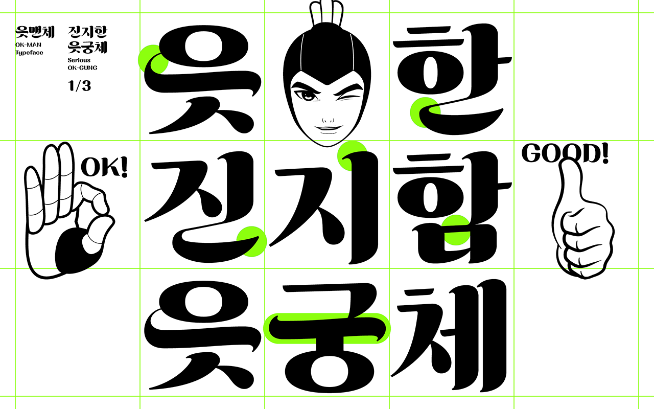 OK금융그룹 전용서체 ‘읏맨체’는 「읏찬체」, 「읏궁체」, 「읏뚱체」 3종으로 구성되어 있어요. 「읏찬체」는 육안으로 느껴지는 이글이글 힘찬 기운이 특징이고, 「읏궁체」는 운율감 있는 자소 디자인과 붓글씨에서 오는 자유로운 강약 조절에서 섬세함이 느껴집니다. 「읏뚱체」는 뚱글뚱글 모난 곳 없이 귀엽고 엉뚱한 느낌이 특징이죠. 세 폰트에는 모두 딩벳(이미지 폰트)를 포함하고 있어요. OK금융그룹의 슈퍼 히어로 읏맨이 전하는 글자의 유쾌함을 무료로 만나보세요!