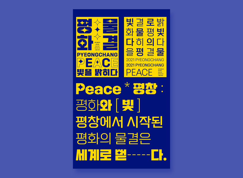 평창군 전용서체는 「평창 평화체」, 「평창체」 2종으로 평화의 빛을 모티브로 개발되었어요. ‘희망의 언어로 모두의 소망을 말하는 평화의 서체’라는 콘셉트에 맞추어 진취적이고 긍정적인 인상을 글자에 부여했습니다. 빛을 연상하게 되는 강한 밝기와 은은한 빛을 토대로 굵기를 구성하여 제목용 「평창 평화체」, 본문용 「평창체」가 탄생했어요.