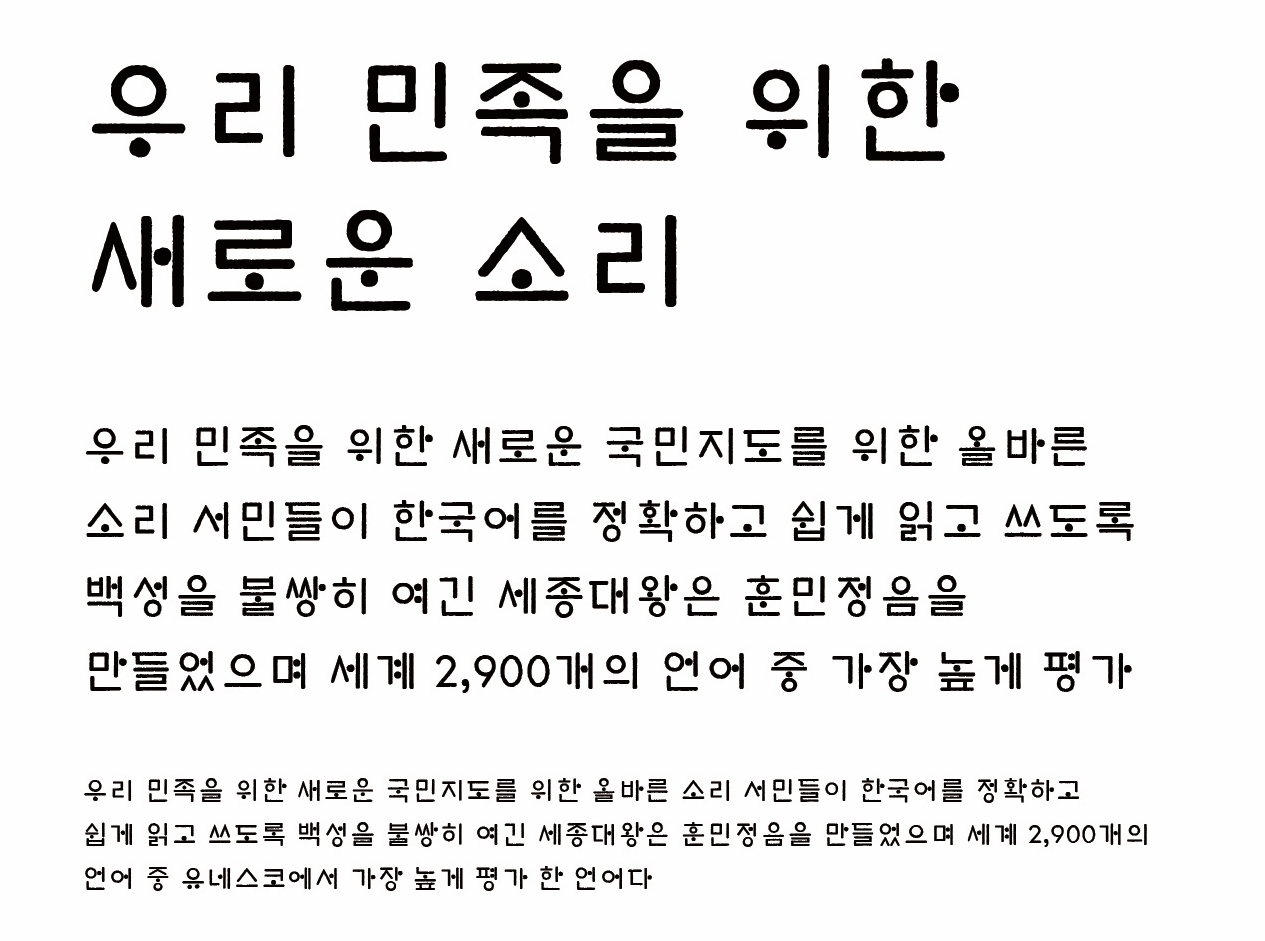 입사하자마자 맡았던 첫 프로젝트가 한글과컴퓨터의 [한컴 훈민정음 가로쓰기체](2021)였어요. 기존에 개발되어 있던 세로쓰기용 서체를 현대적 사용성에 맞추어 가로쓰기용으로 만드는 작업이었습니다. 훈민정음 창제 원리가 담긴 세로쓰기체의 아이덴티티를 최대한 유지하면서 현대적 미감을 담아내는 게 관건이었죠.