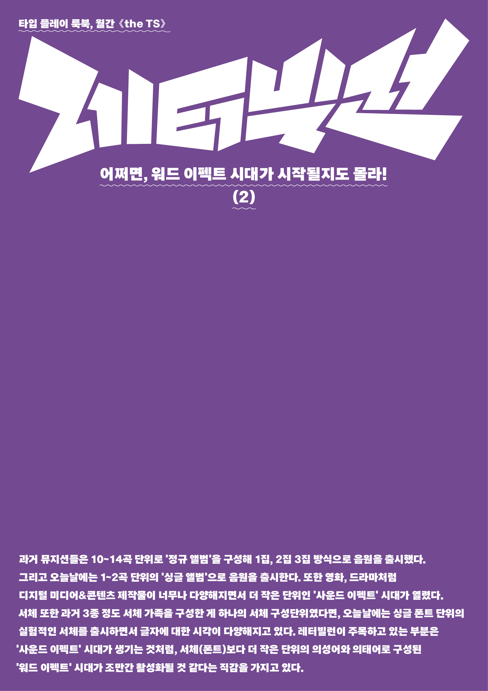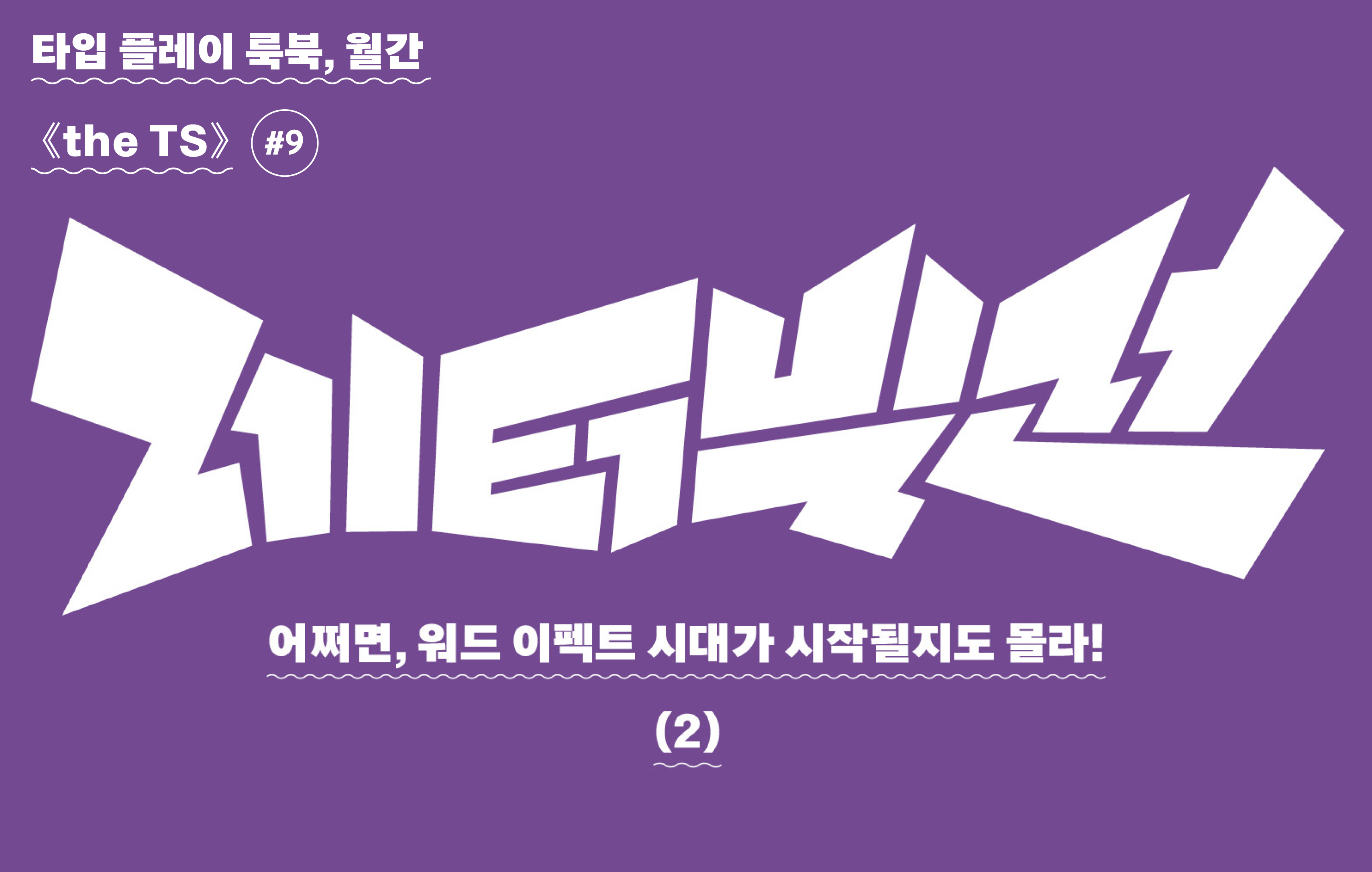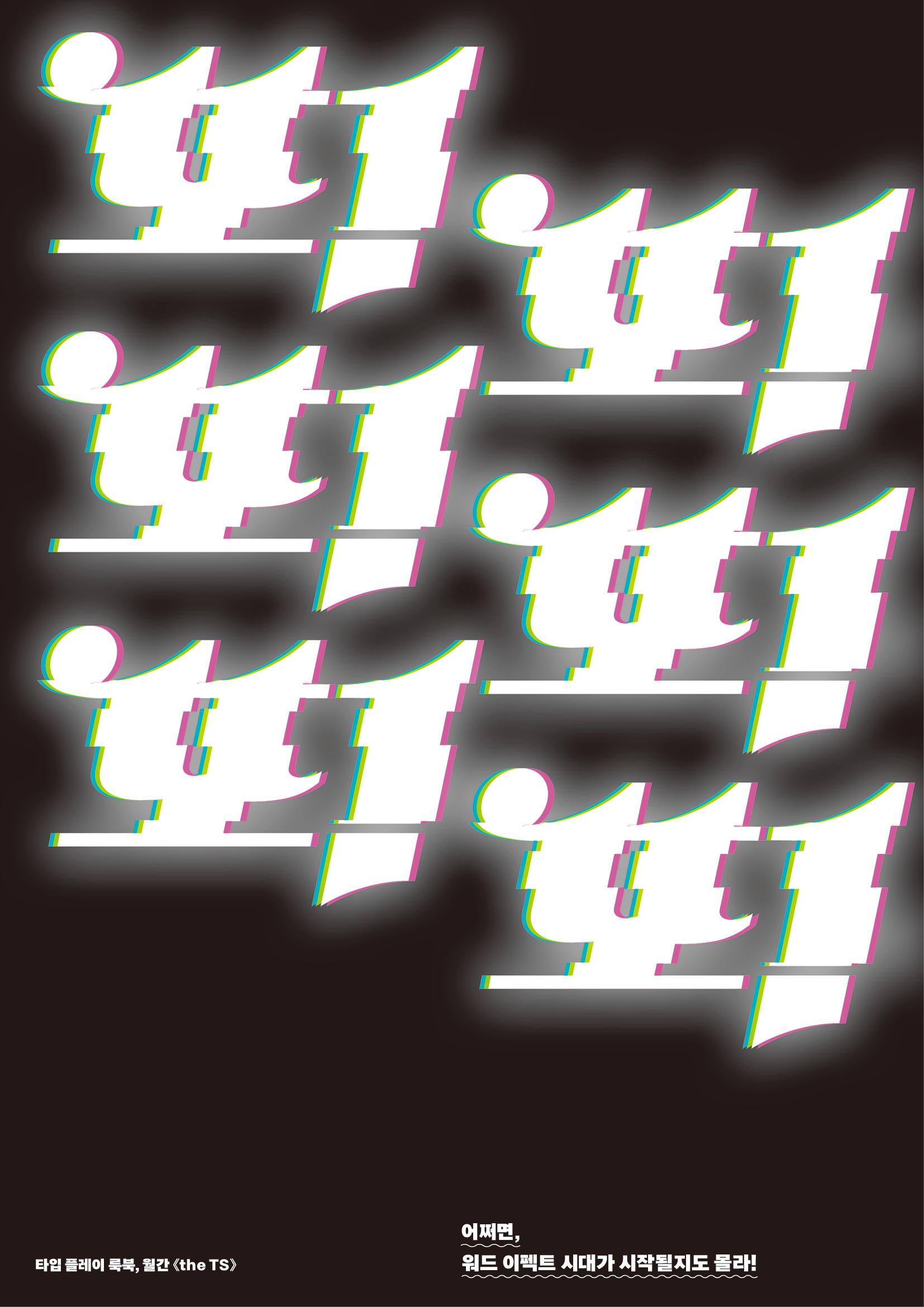 월간 《the TS》 9월호는 올해 5월호의 후속편입니다. 워드 이펙트는 사운드 이펙트(Sound Effect)의 글자 버전이라 할 수 있는데요. 청각을 자극하는 음향 효과처럼 글자(단어)로 사용자의 시각에 가 닿아 감응을 일으키는 타이포그래피 기법의 명명이죠. 타이포 브랜딩 스튜디오 엉뚱상상(DDUNGSANG)의 폰트 디자인 팀 레터빌런(Letter Villain)이 주창하고 연구 중인 프로젝트이기도 합니다. 레터빌런은 워드 이펙트를 “디지털 화면에서 생존할 수 있는 타이포그래피 기법”으로 규정하고 있어요.